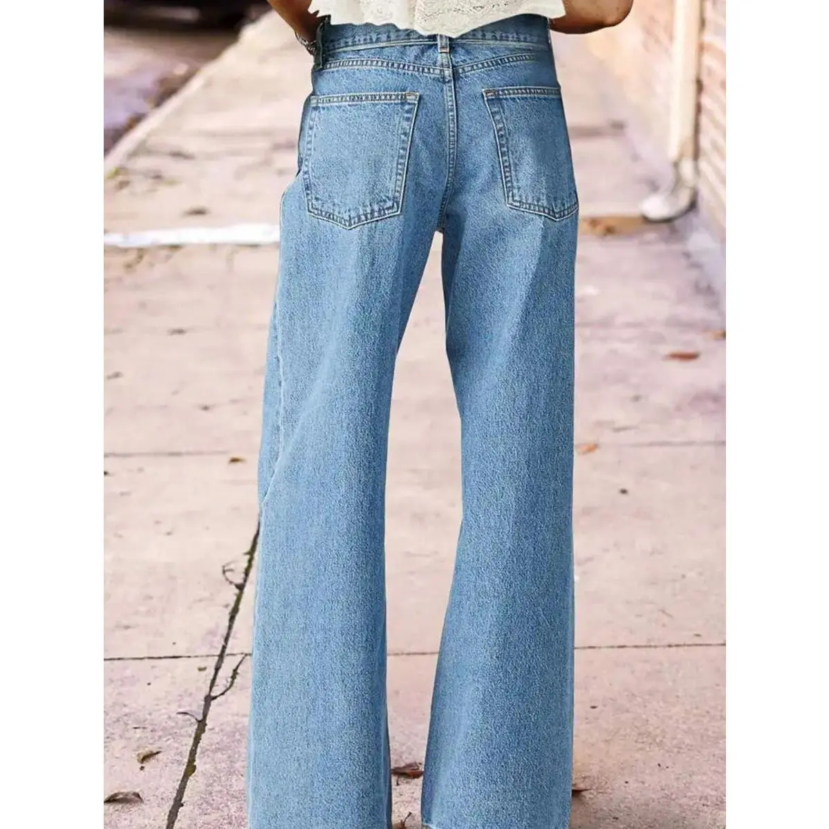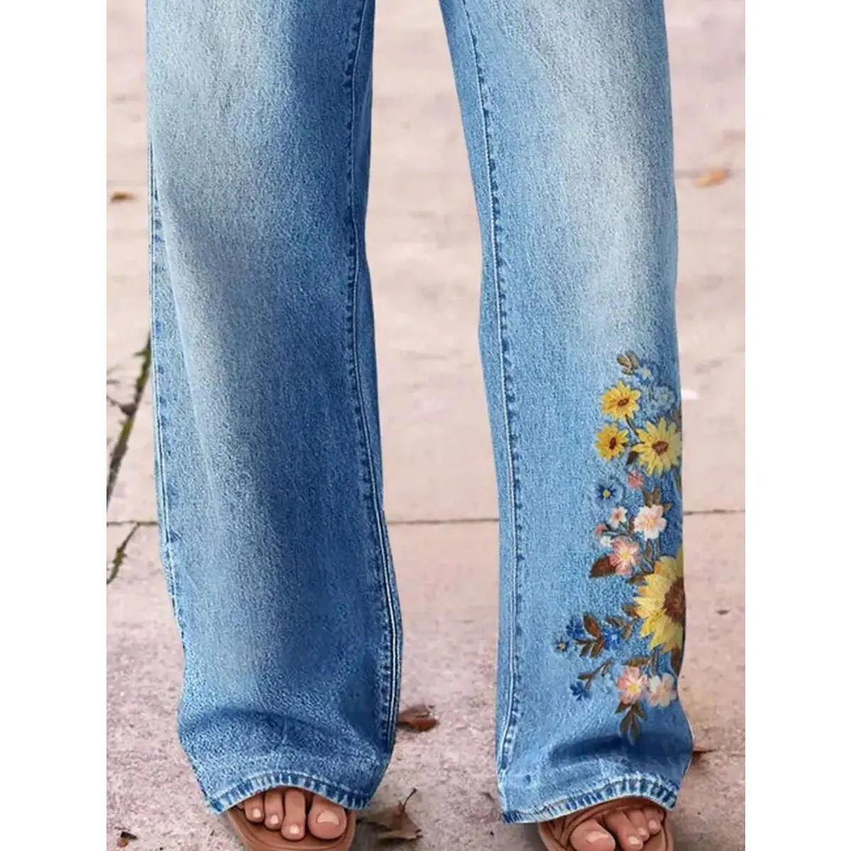 Women's Washed Blue Fashion Embroidered Print Micro-Elastic Slim Straight-Tight Casual Jeans