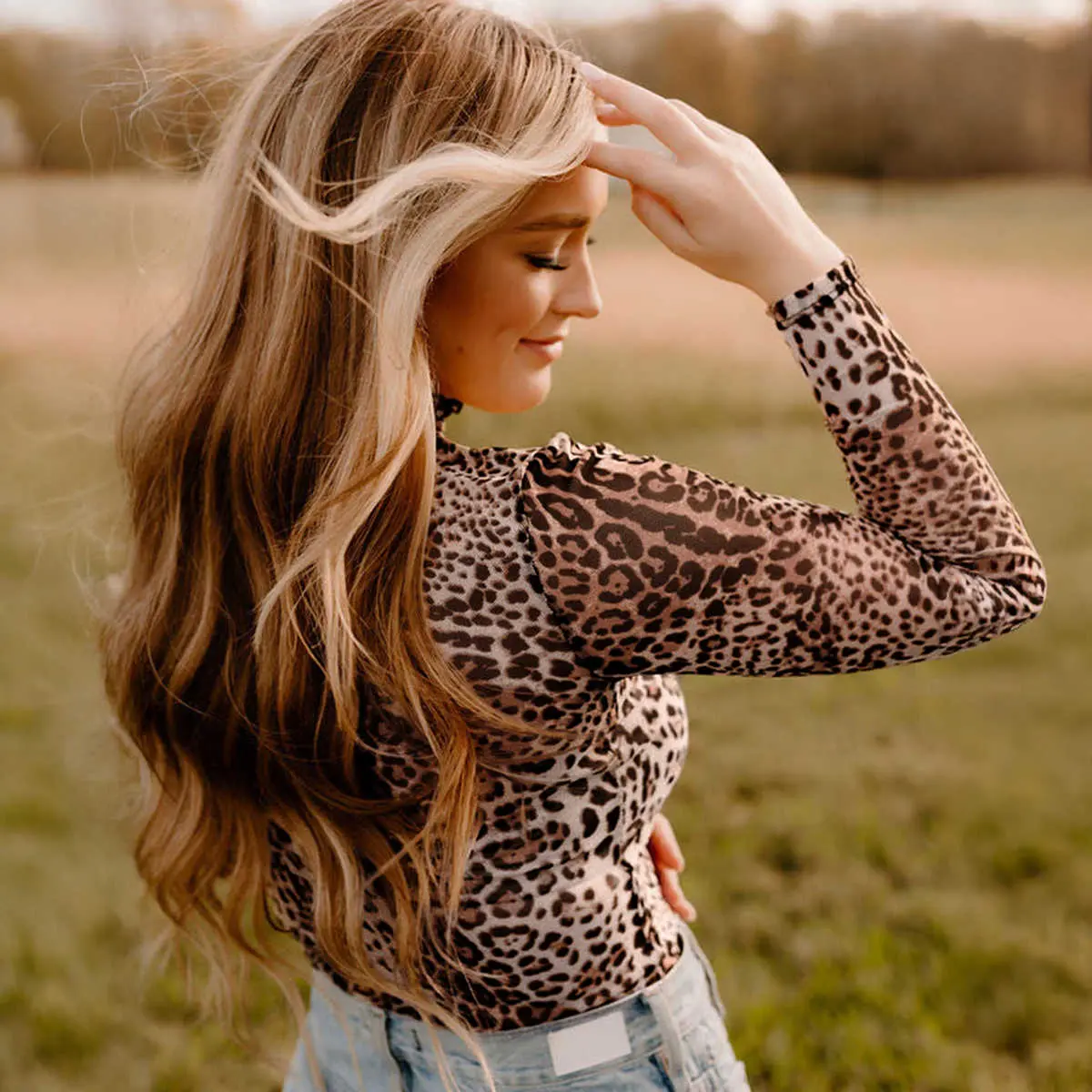 Brown Leopard Smocked Neck Mesh Long Sleeve Bodysuit