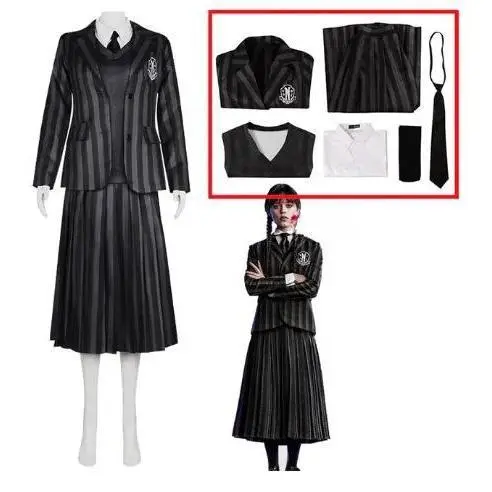 The Addams Family Wednesday Cosplay Costume Girl School Black Uniforms Suit Dress Woman Halloween Party Clothes Wig