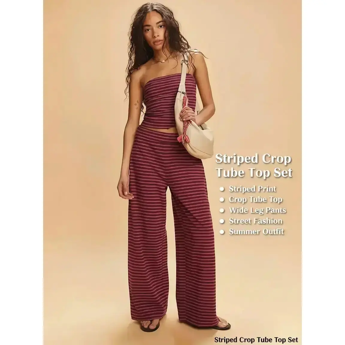 Women's Striped Print Crop Tube Top & Wide Leg Pants Set, Street Fashion Casual Two-piece Set for Daily Wear, Women's Summer Clothes, Cute Summer Outfit