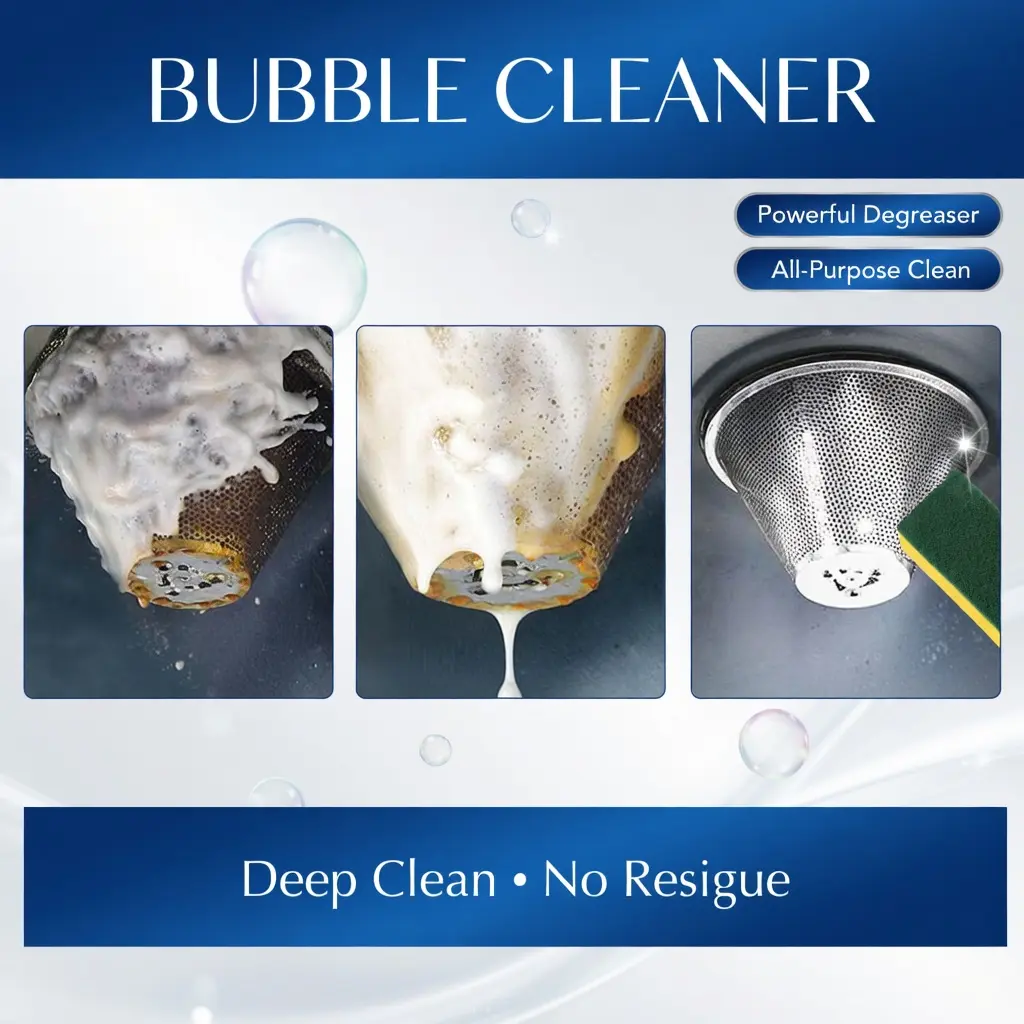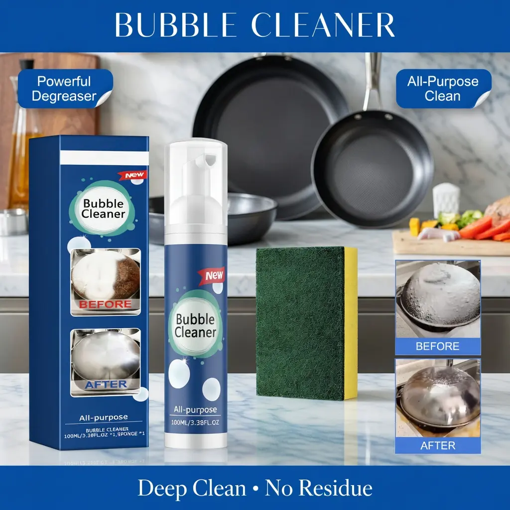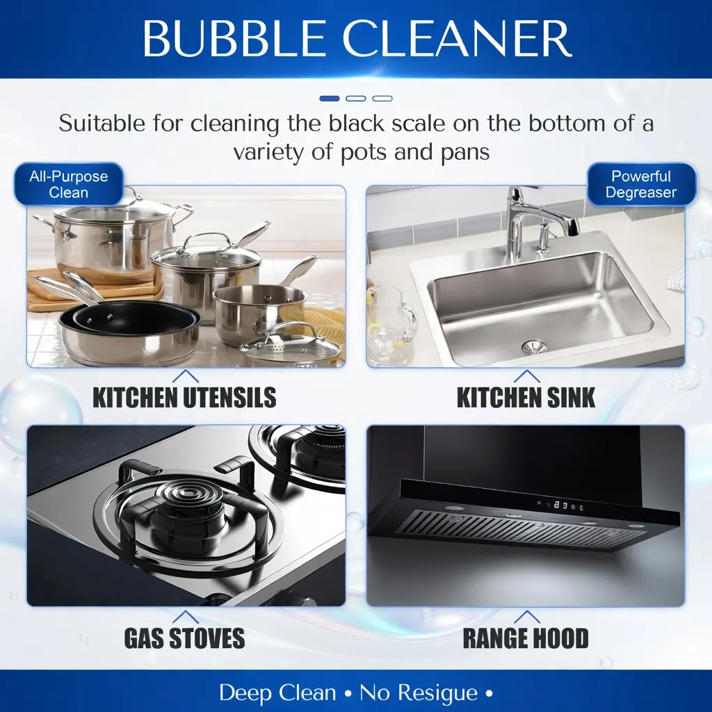 Our kitchen grease foam cleaner contains baking soda, lemon extract, and bio-enzymes. It is gentle on kitchen utensils, has strong surfactant penetration, gradually breaks down dirt, prevents rust, and is anti-oxidative. Its usage is very simple: just spray the product directly onto the desired area and wipe with a sponge. It also provides long-lasting cleanliness and shine, and after removing stains, it forms a protective layer to prevent rust, providing comprehensive maintenance