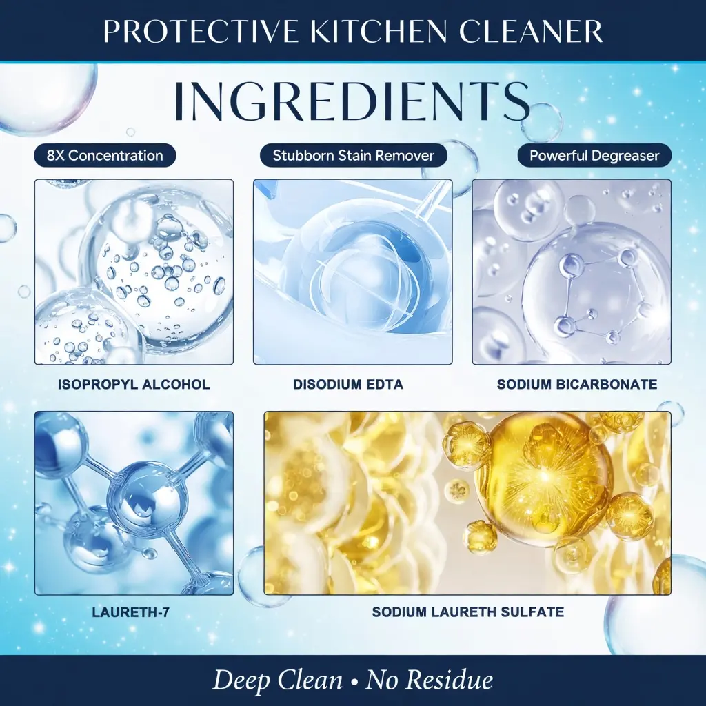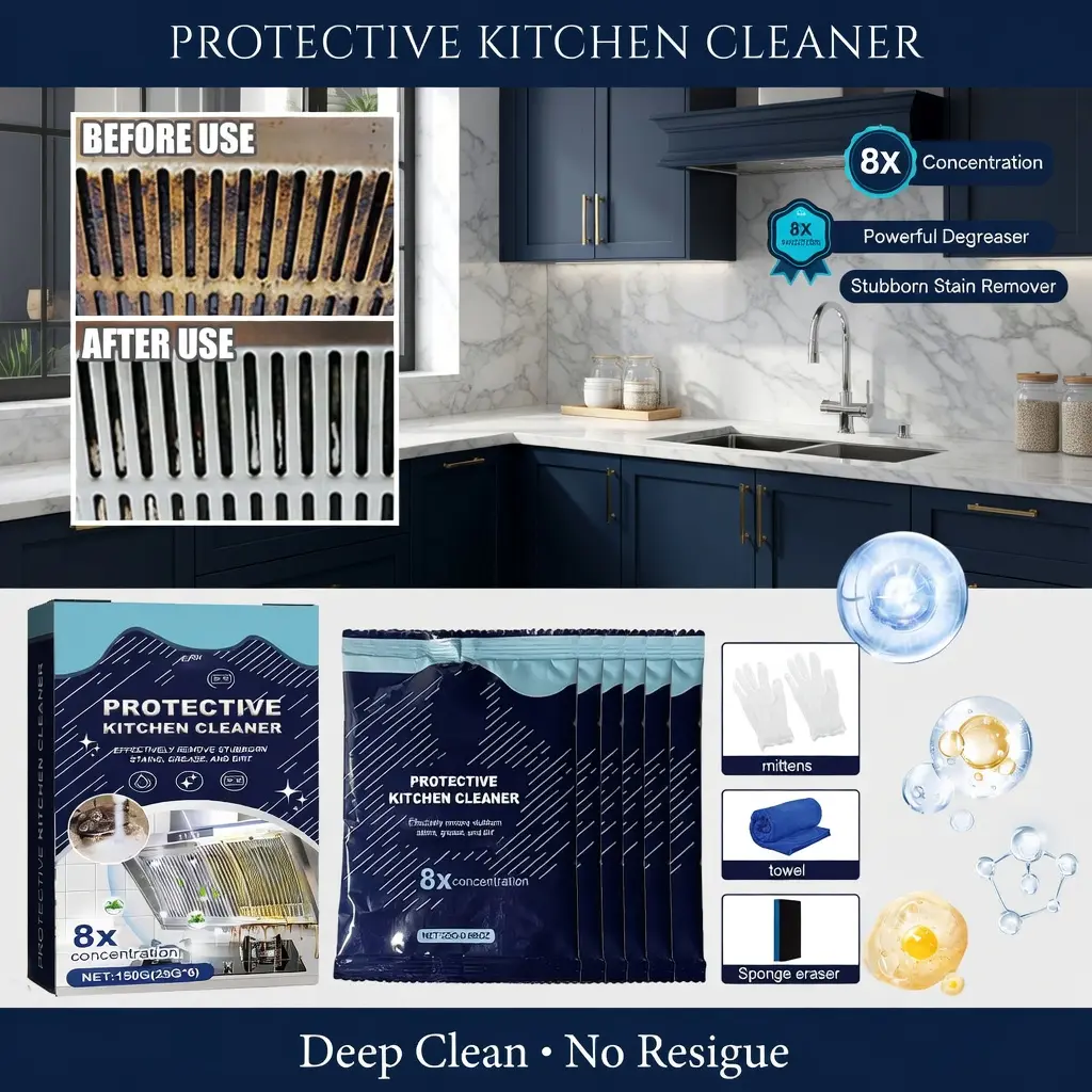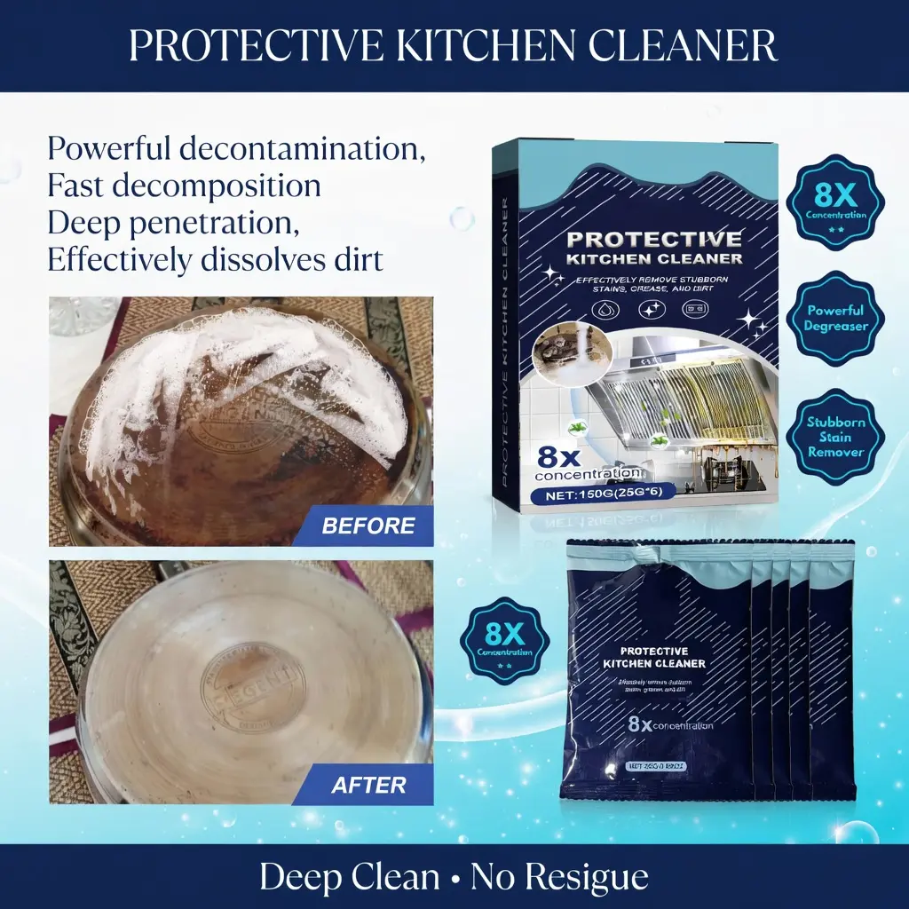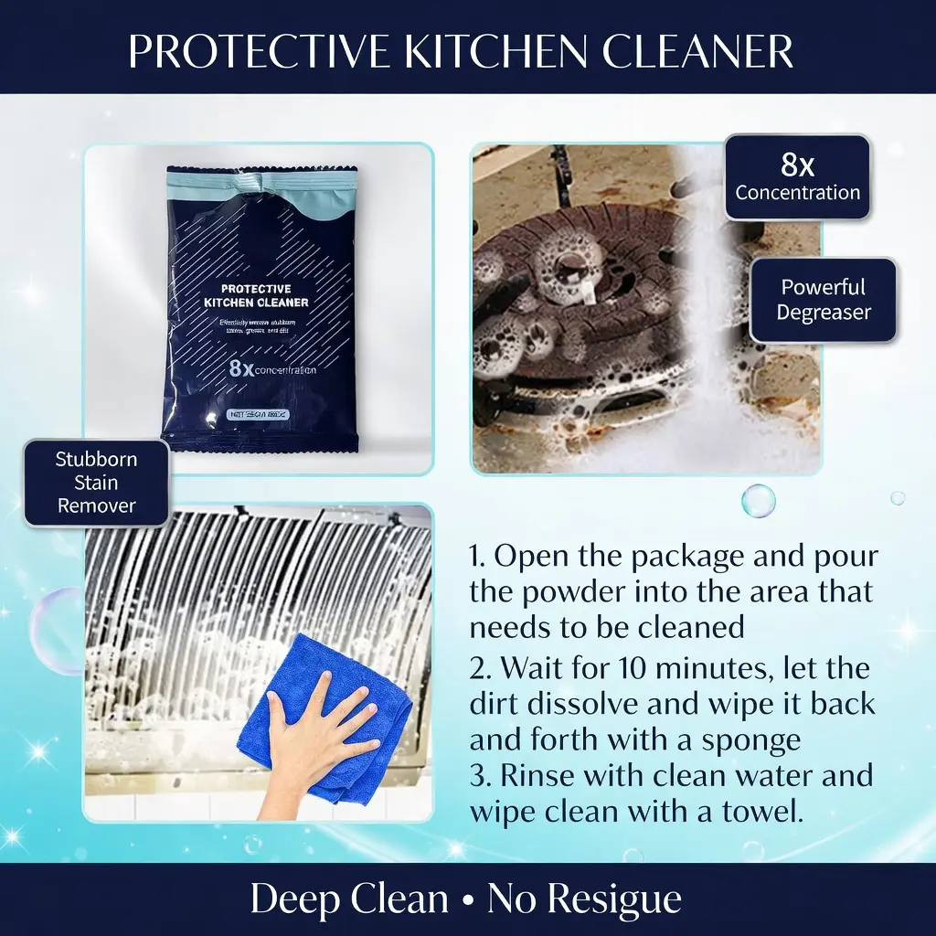 Our kitchen cleaning and stain remover powder (boxed) contains isopropyl alcohol, EDTA disodium, and sodium bicarbonate. It can help you tackle stubborn stains, making your kitchen as clean as new. It effectively combats kitchen grease, burn marks, and stubborn dirt. Its usage is very simple: open the package, pour the powder onto the area that needs cleaning, wait for 10 minutes to allow the dirt to dissolve, then wipe back and forth with a sponge, rinse with water, and then wipe clean with a towel. It can also clean kitchen stains