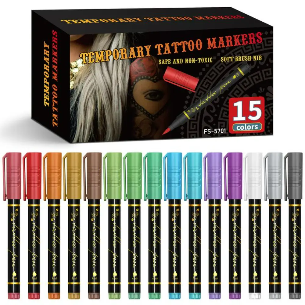 Unleash your creativity with our 15-count temporary tattoo markers—your go-to for bold, vibrant body art, face paint, and festival makeup! Designed with flexible soft brush tips, these skin-safe pens deliver ultimate precision, whether you’re sketching fine lines, filling bold patterns, or blending seamless gradients.