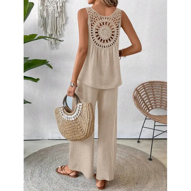 Women's Vacation Sleeveless Top With Lace Mesh Back & Wide Leg Pants Set, Apricot, For Spring/Summer