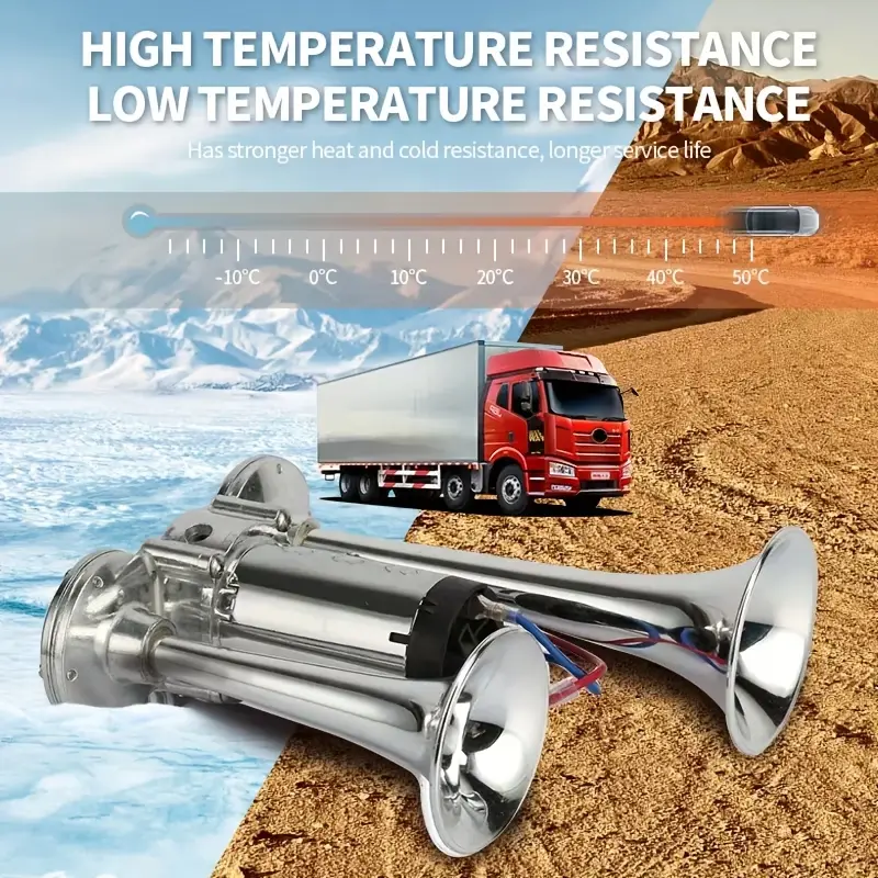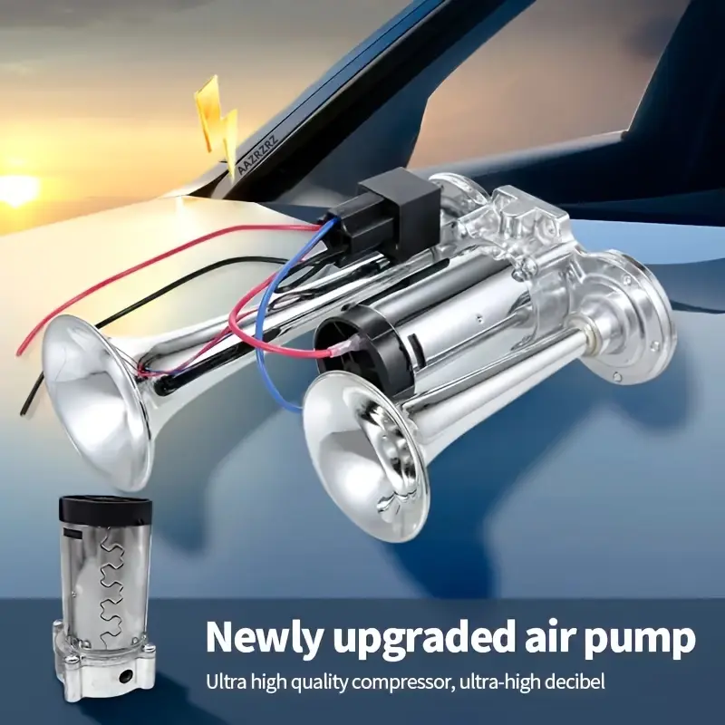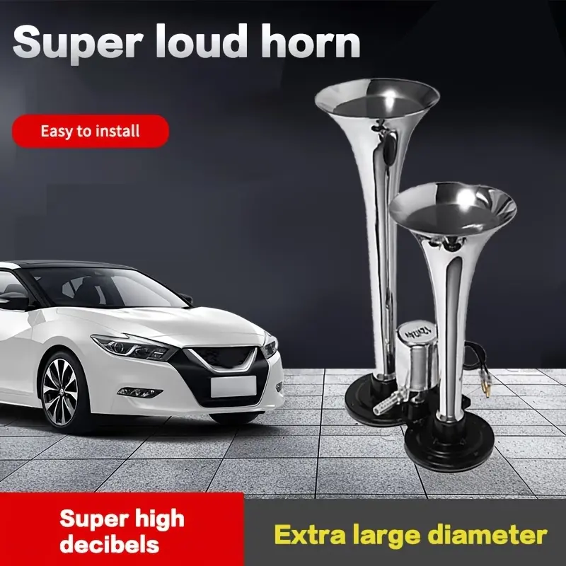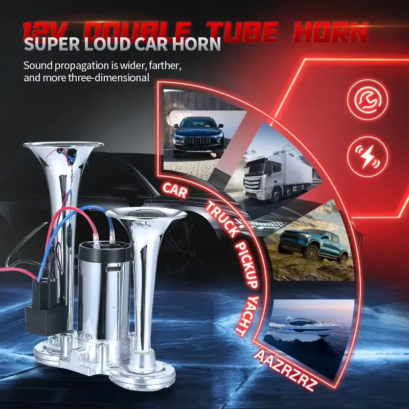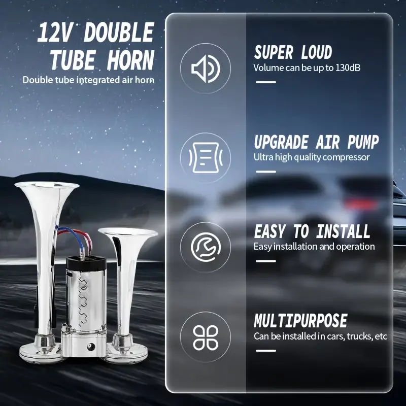 FeatureBenefit130DB Super LoudCuts through highway noise, rain, and chaos – gets instant attentionDual Trumpet DesignProduces a rich, harmonic train-like blast (two different tones)Zinc Alloy + ChromeLooks sharp, resists rust – built to last under the hood12V Air CompressorPlugs into any 12V vehicle battery – complete kit includedUniversal FitWorks on cars, trucks, SUVs, motorcycles, boats, RVs, tractors