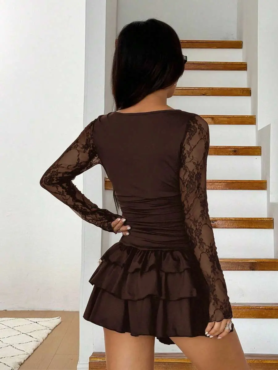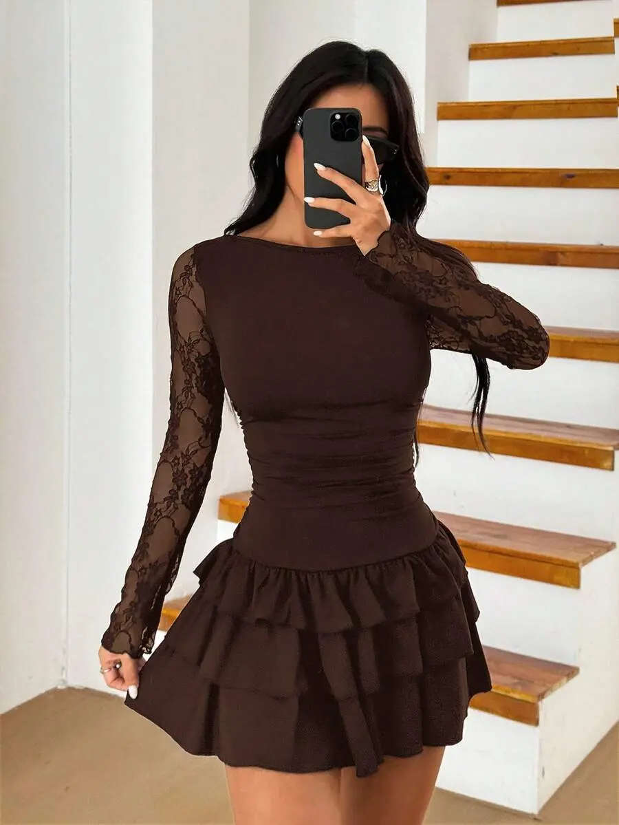 Women's New Autumn Lace Patchwork Layered Ruffle Hem Mini Dress ,Chocolate Brown Dress Brown Short Dress Coffee Brown Dress Dark Brown Dress,Dresses For Women Elegant