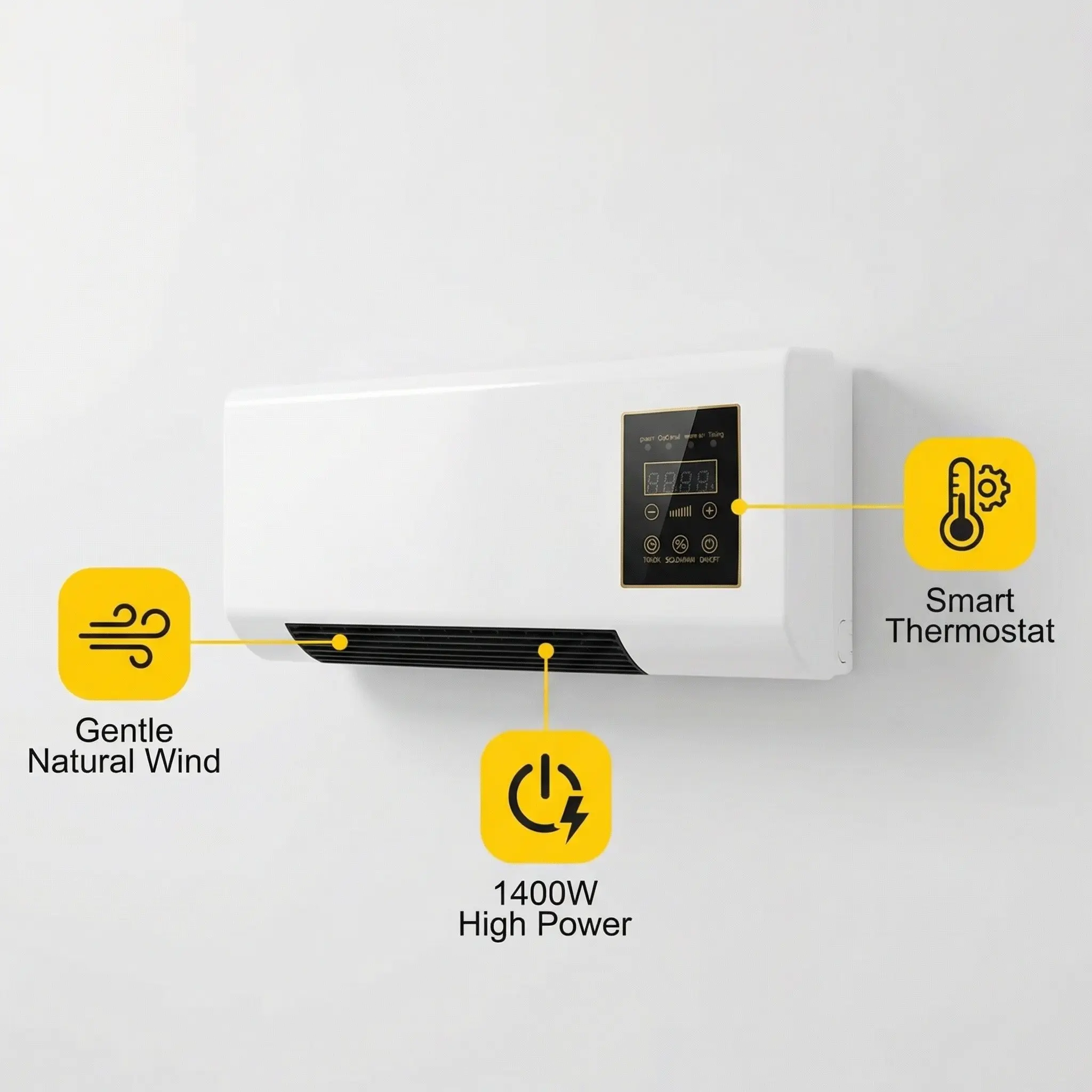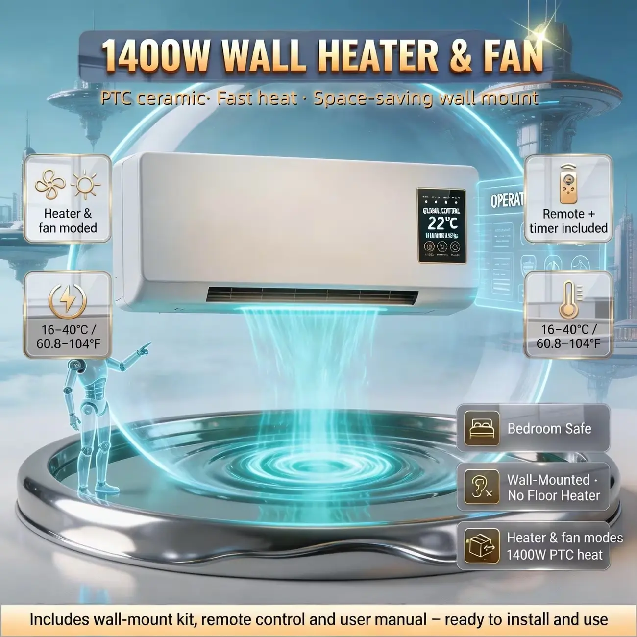 Install this fan to improve air circulation and warmth. Its wall-mounted design saves space and adds a modern touch to your room. Perfect for creating a cozy and comfortable atmosphere.