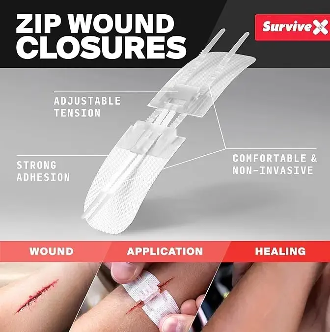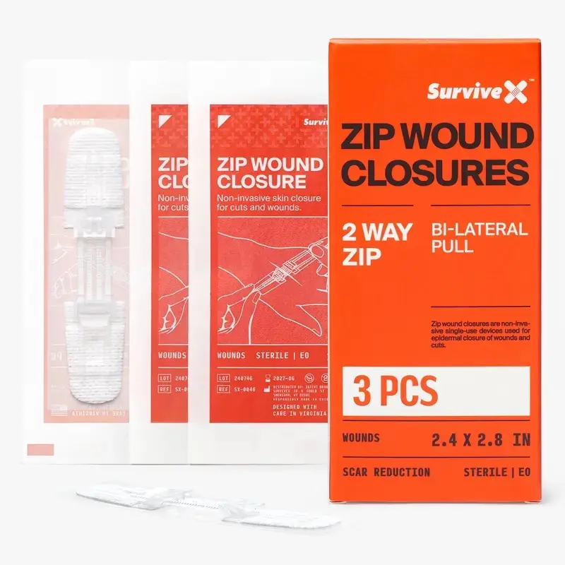 SURVIVEX Zip Wound Closure Strips - 3 PCS - Repair Wounds Without Stitches - 2 Way Zip - Bi-Lateral Pull - Sterile - 2.4 x 2.8 IN - Gentle on Skin