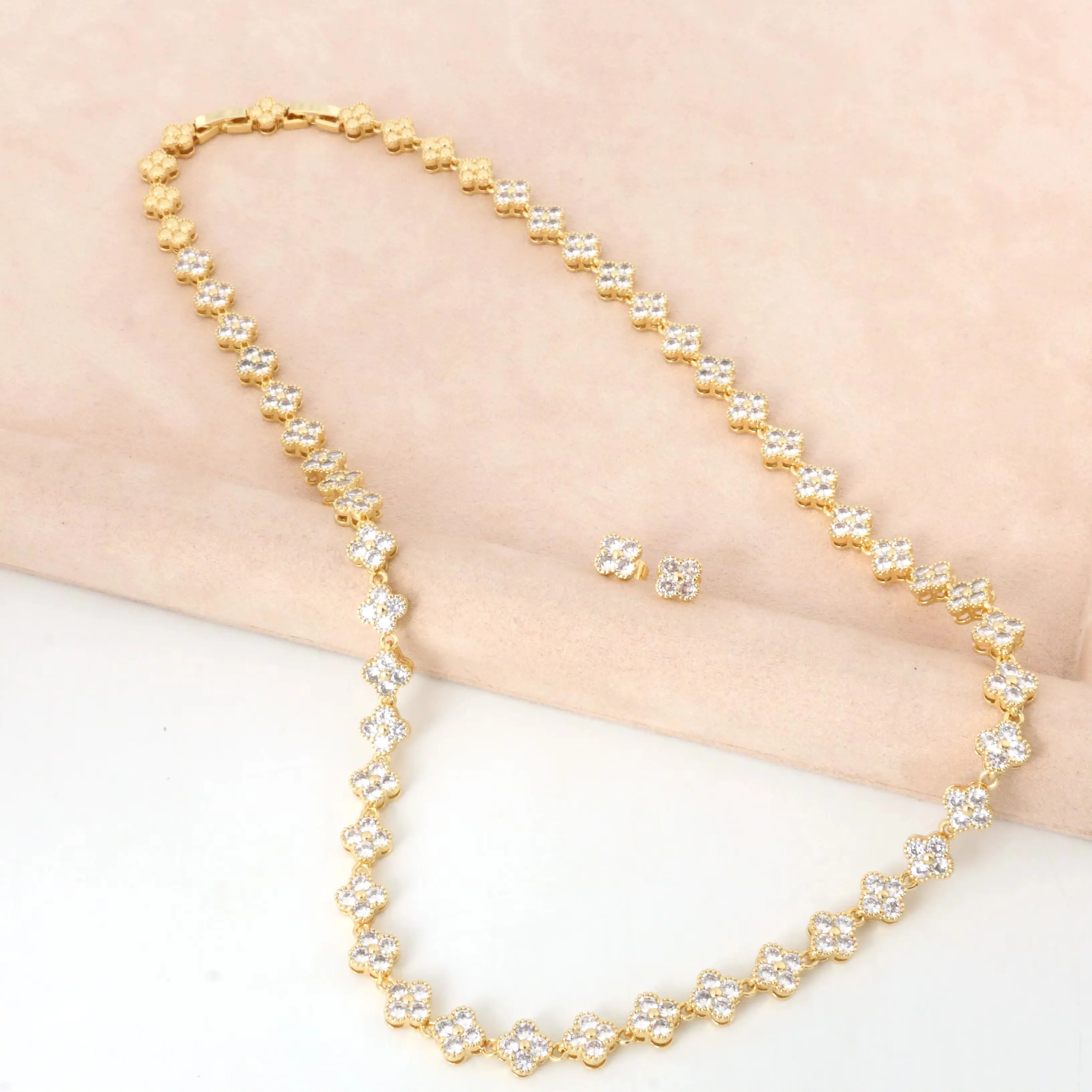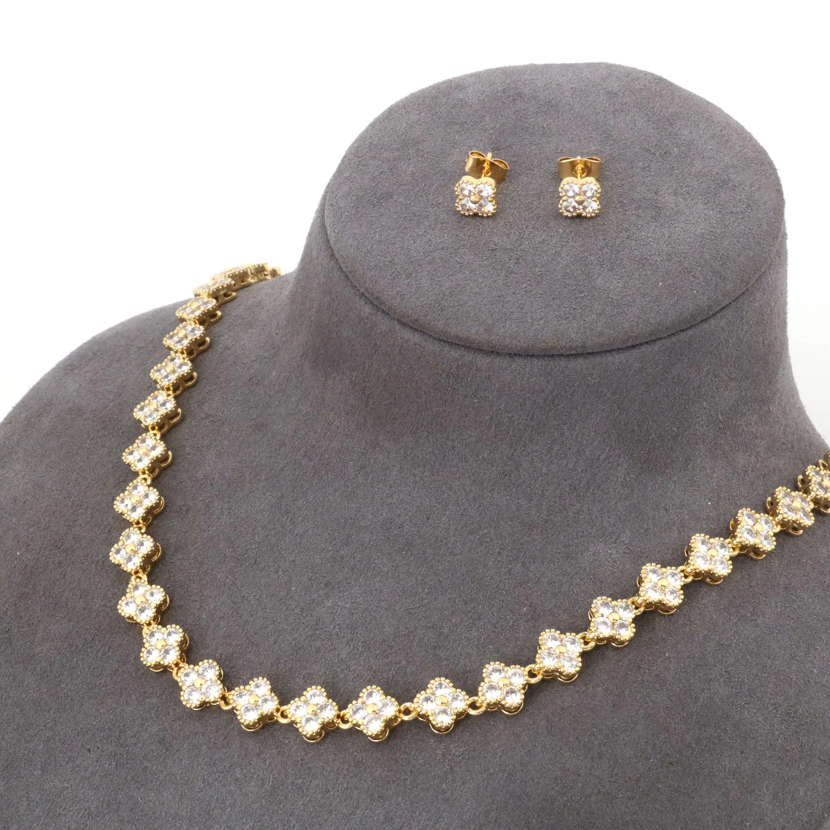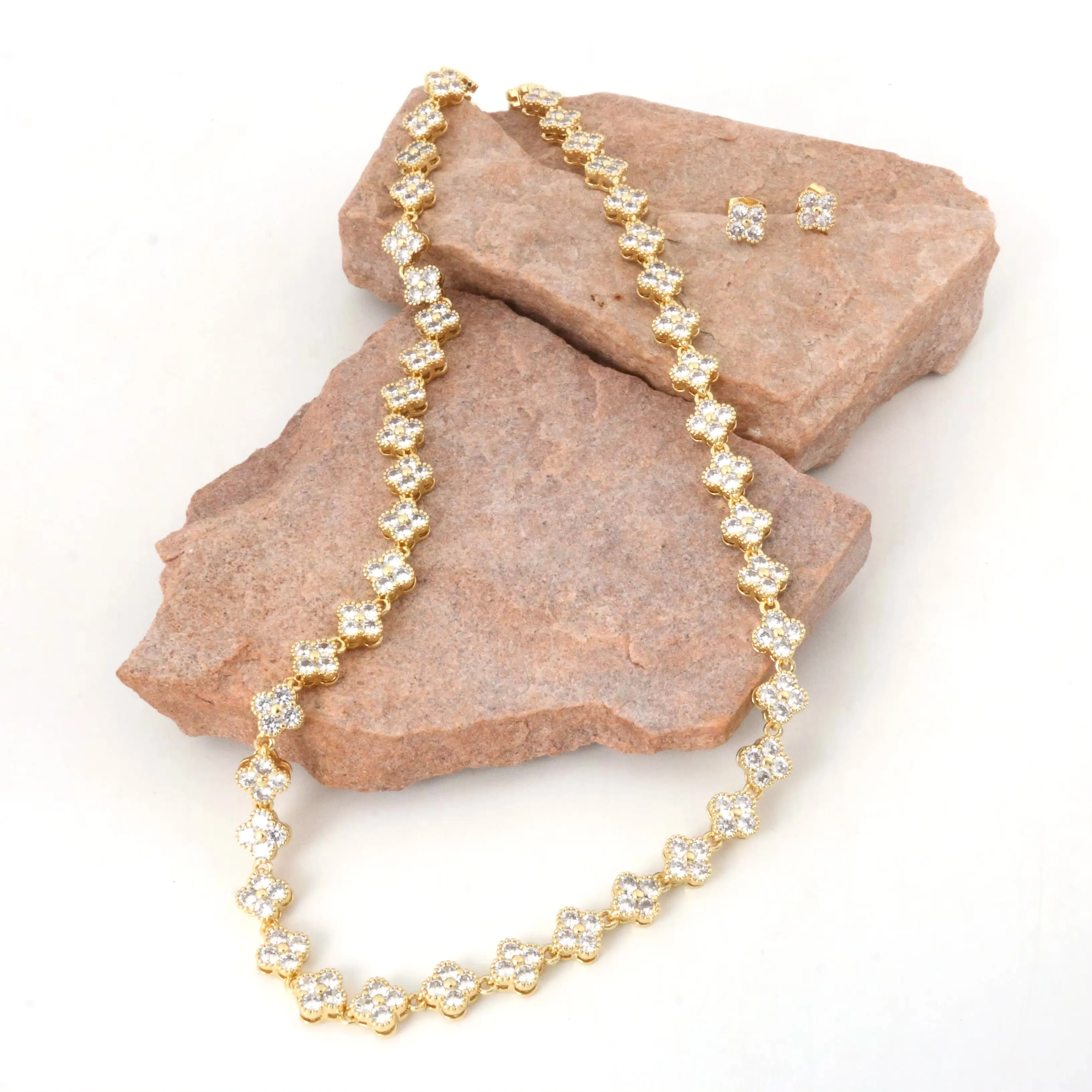 Crafted from high-quality copper and finished with a radiant gold plating, it offers a luxurious shine and lasting durability. Each piece is adorned with sparkling zircon stones, enhancing the floral design with brilliance and sophistication.