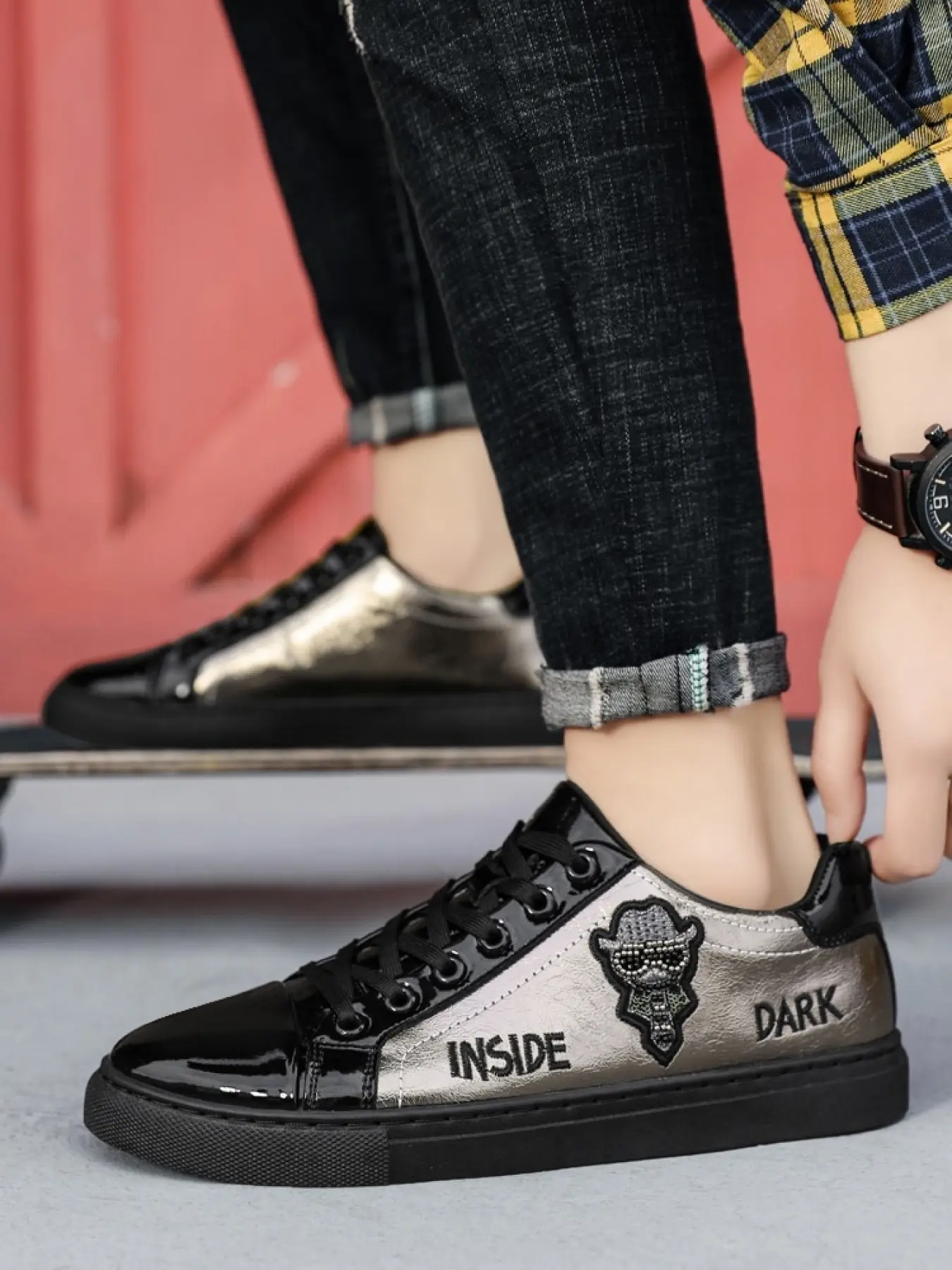 1 Pair Men's Dark Style Metallic Casual Shoes Shiny Leather Personalized Eye-Catching Soft Sole Comfortable Anti-slip Wear-resistant Trendy All Match For Daily Outings And Commute