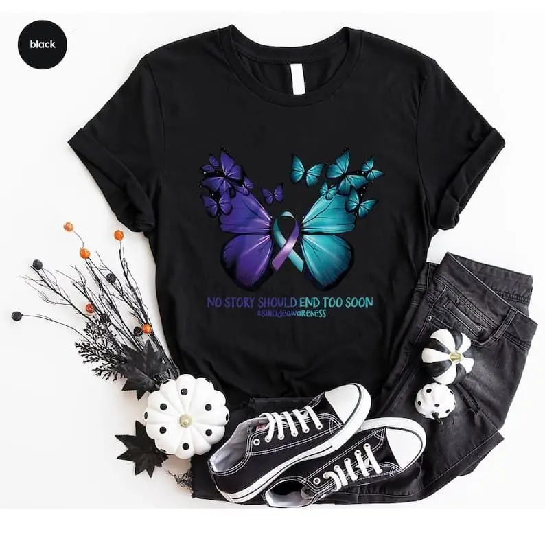 5. Suicide Prevention Awareness Shirt, Mental Health Shirt, Therapist Tshirt, Semicolon Shirt, Butterfly Clothing, No Story Should End Too Soon