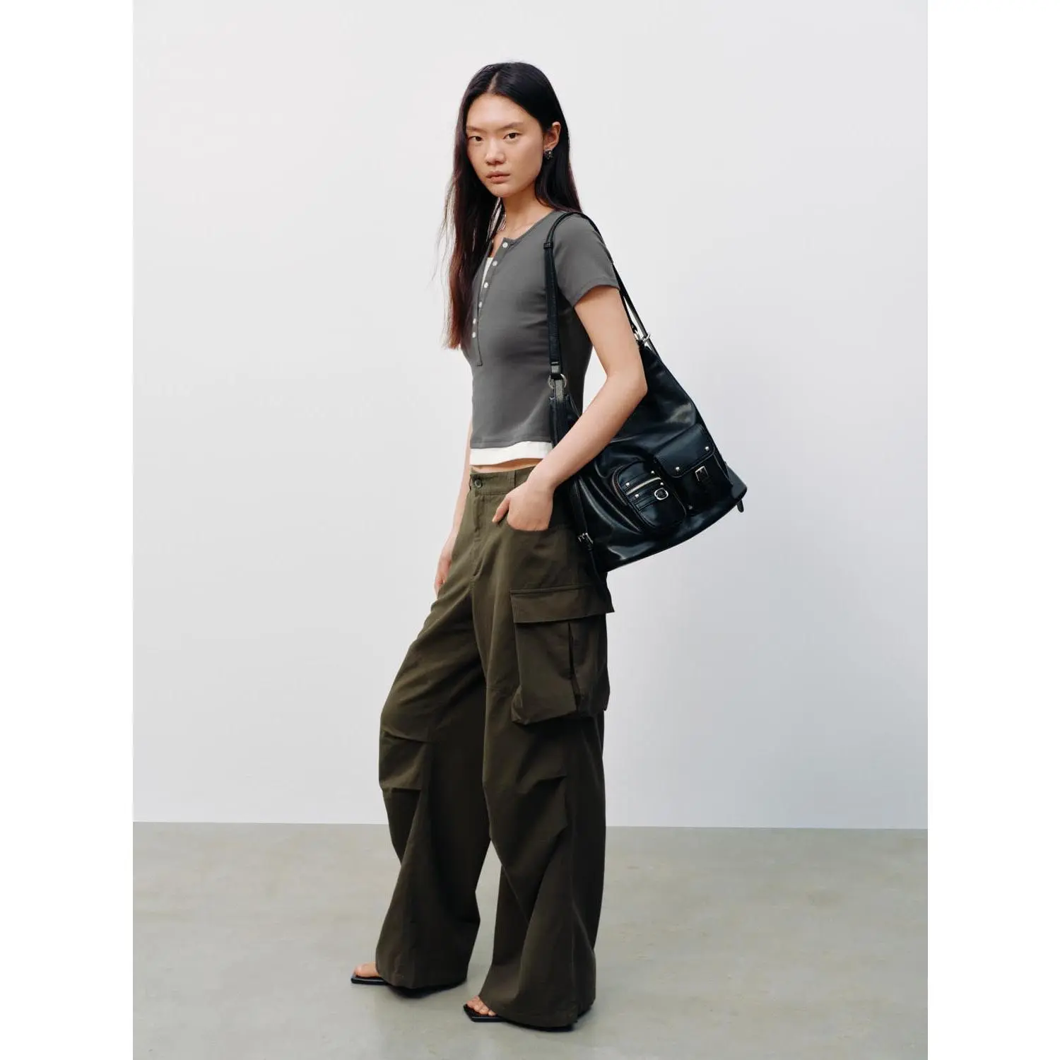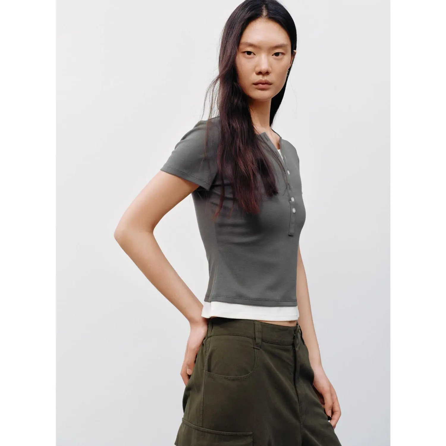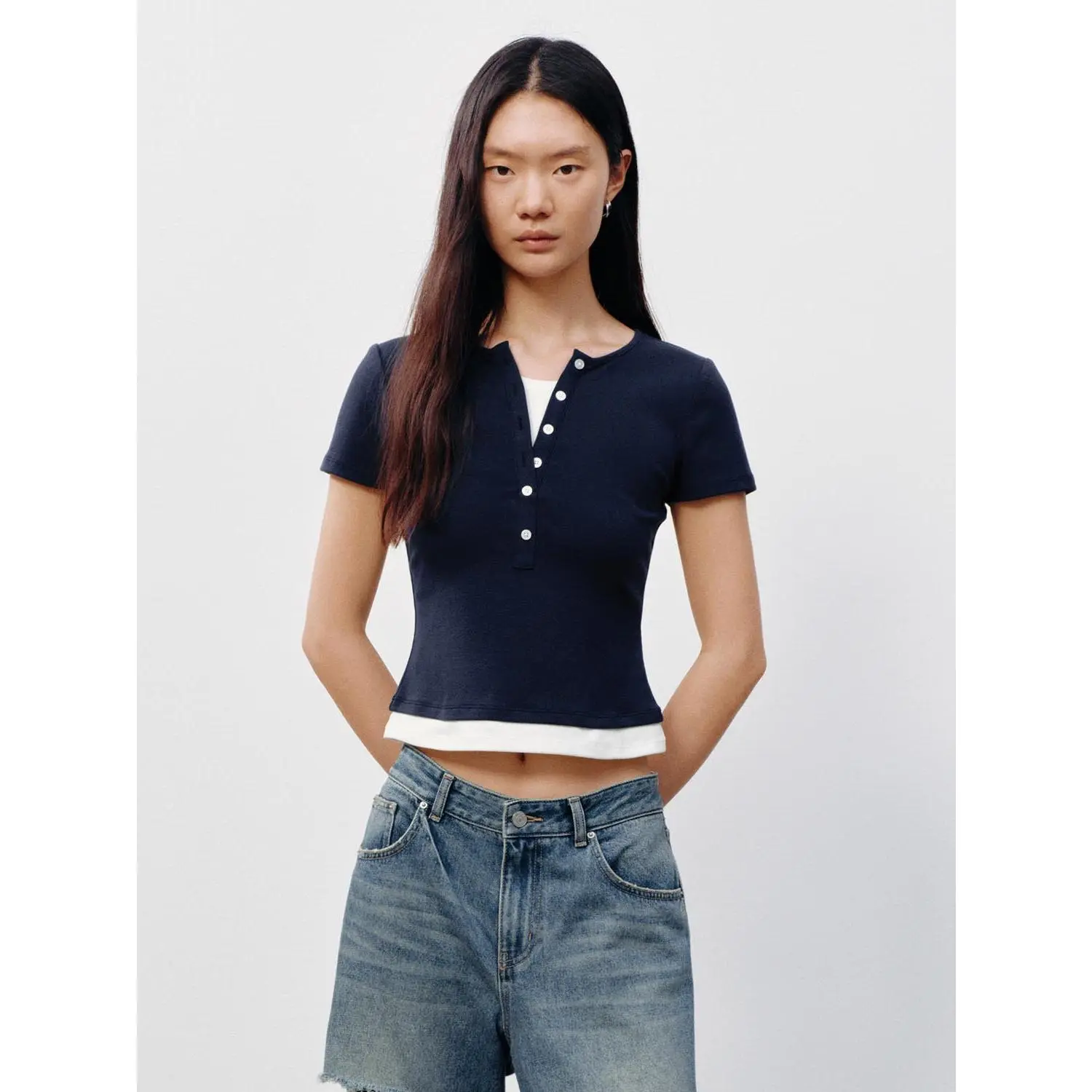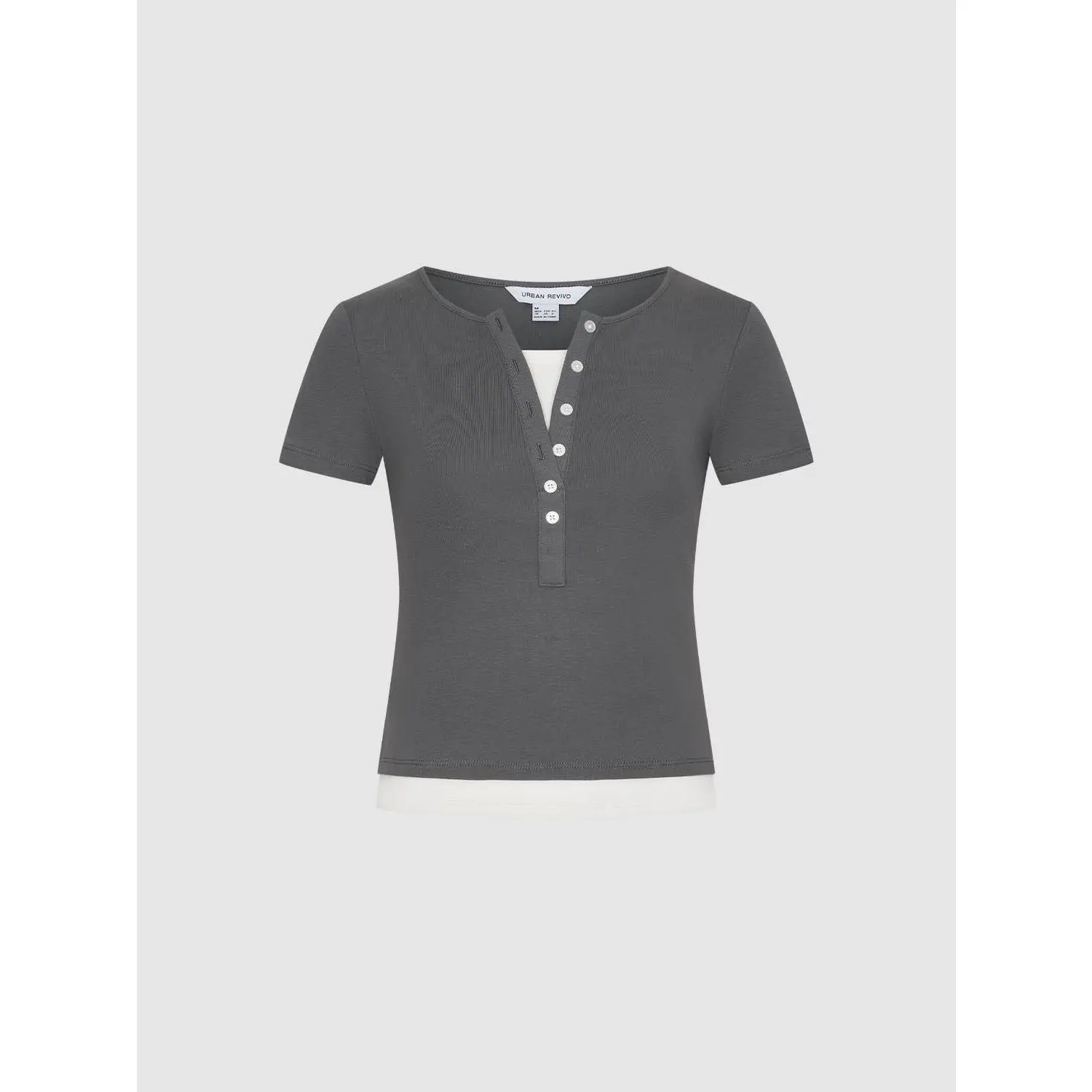 URBAN REVIVO 2026 Summer Women's Casual Color Block Henley Neck Fake Two-Piece Slim Fit T-Shirt UYY460131