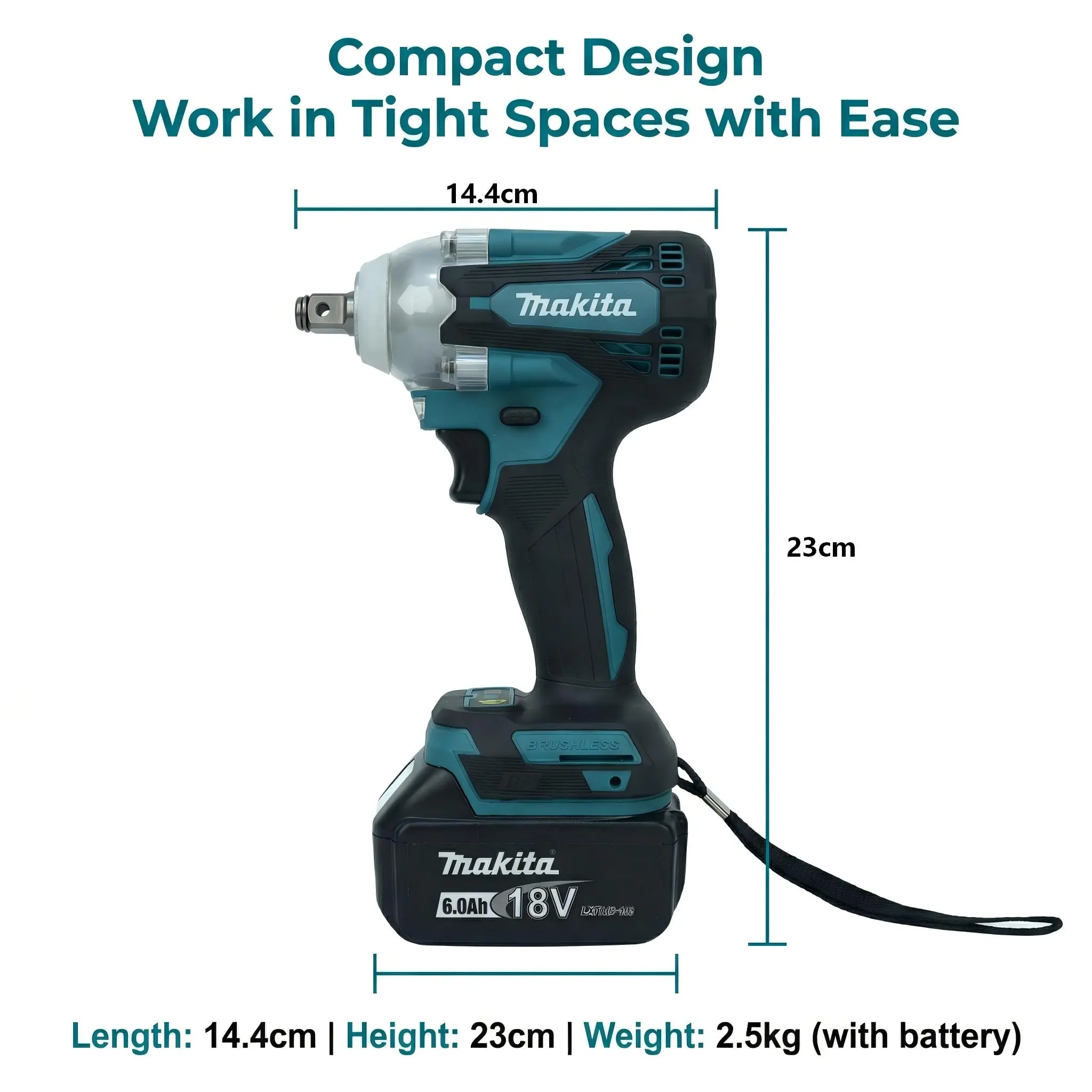 The Makita DTW300 has a body size of approximately 14.4 × 11.7 × 23cm, a compact and balanced structure, and a battery weight of approximately 2.2-2.5kg, balancing portability and stability.