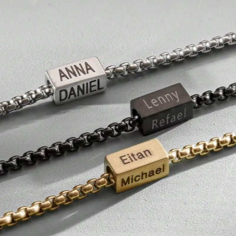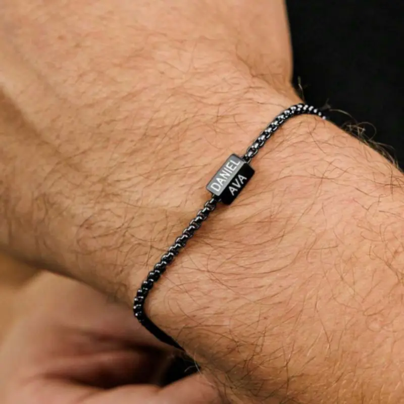 A personalized stainless steel square pendant bracelet for men with custom name engraving, a multi-name engraving bracelet with personalized engraving on 1-4 sides, a stainless steel square pendant bracelet with personalized engraving on 1-4 sides, a Fath
