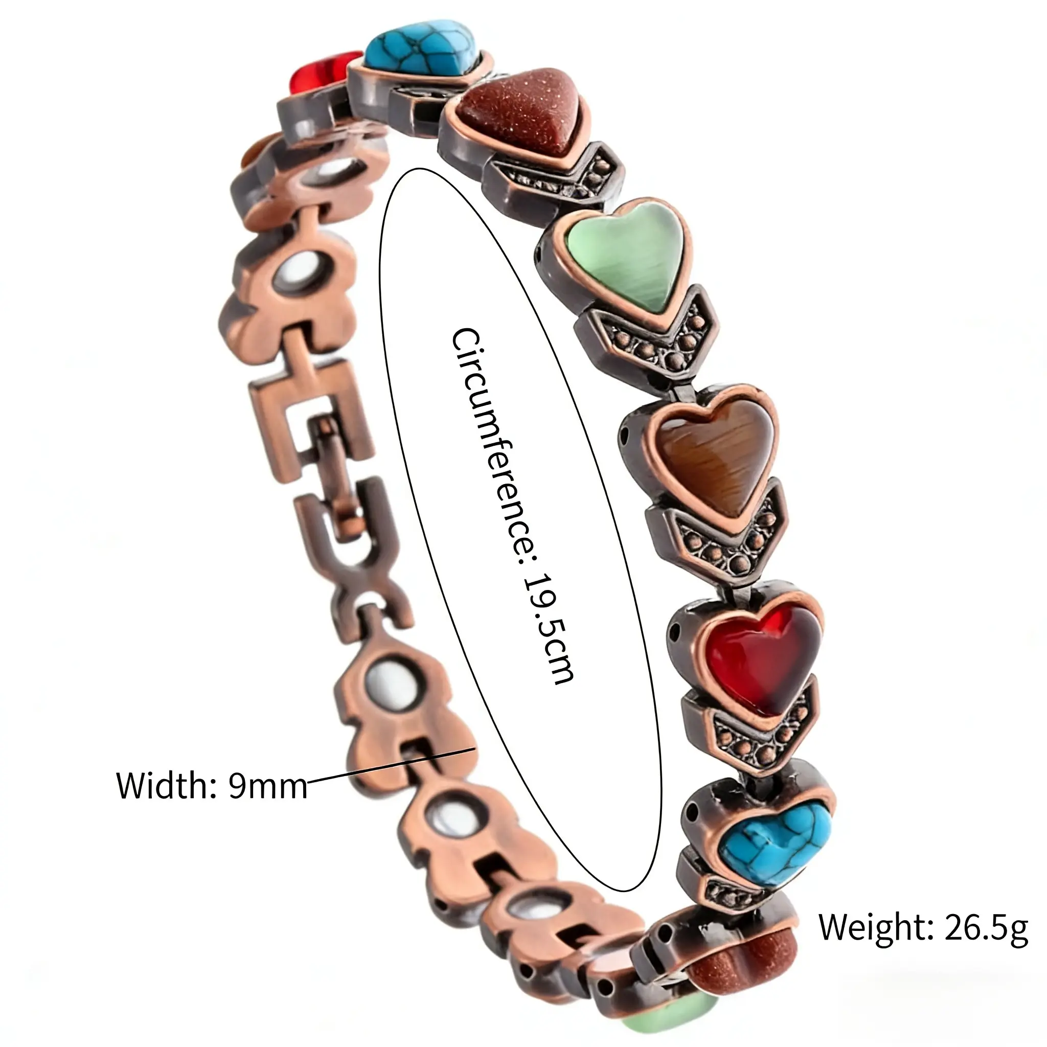 The vintage copper links are paired with multi-color natural gemstone hearts, each with its own unique texture and glow-like wearing a little piece of nature’s universe on your wrist. Built-in high-strength magnets provide gentle wrist relief throughout the day, making commuting, typing, and daily tasks feel noticeably more comfortable.