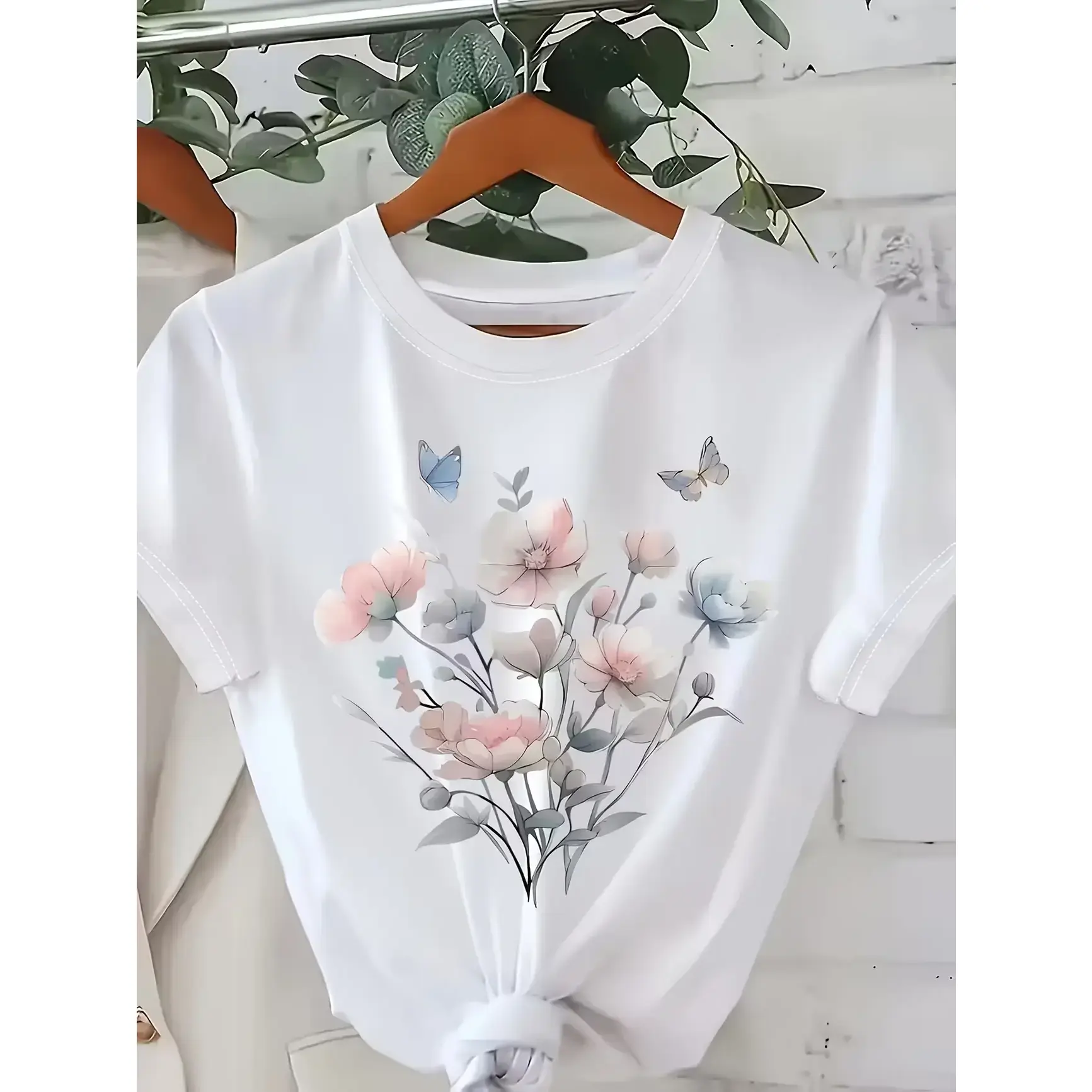 Women'S Watercolor Floral Butterfly Short Sleeve T-Shirt | Chic Crew Neck, Floral Gradient Print, Versatile Daily Commute Top