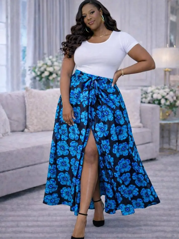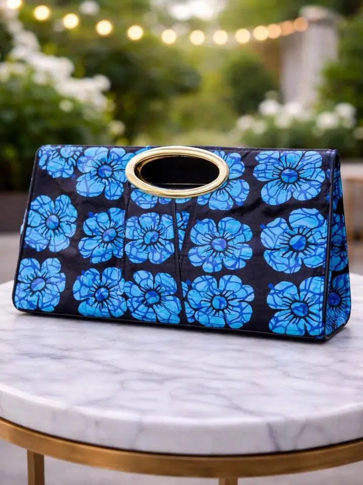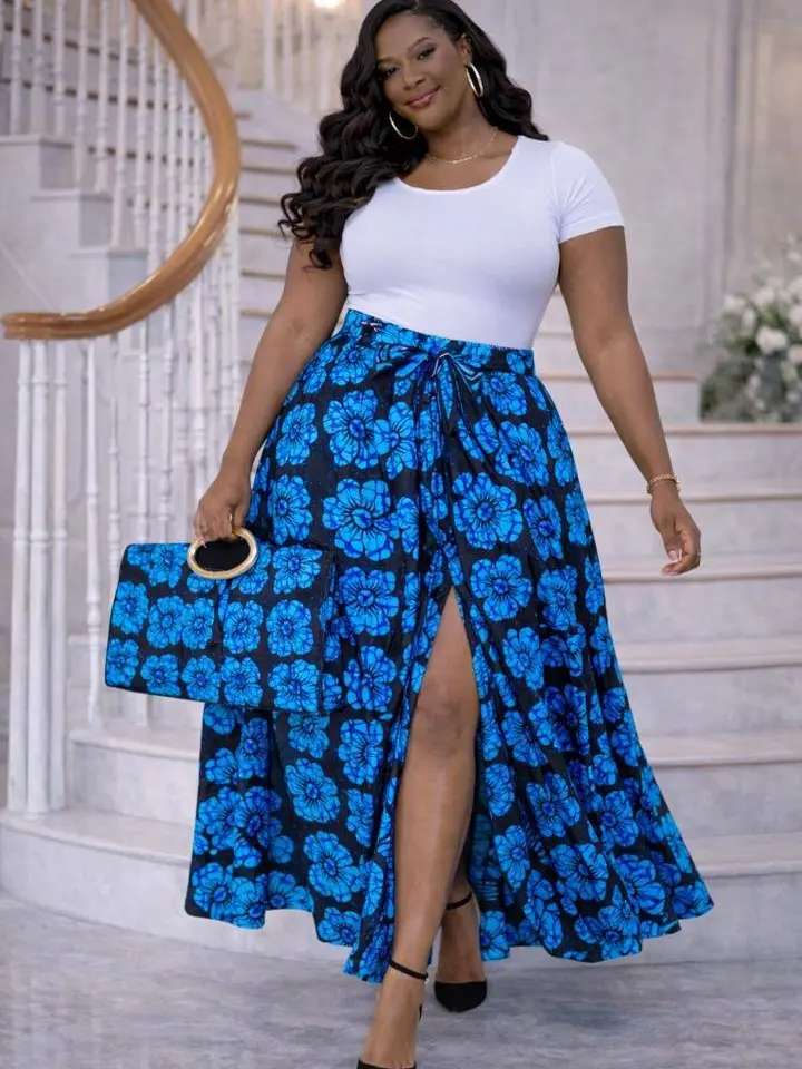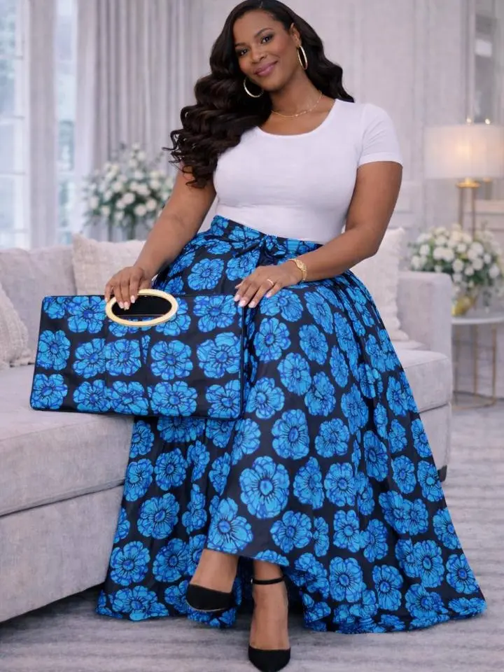 Step into effortless elegance with this stunning African print ensemble designed to turn heads. Featuring a flowing blue floral Ankara wrap skirt paired with a sleek fitted top and a matching statement clutch, this outfit blends tradition with modern sophistication.