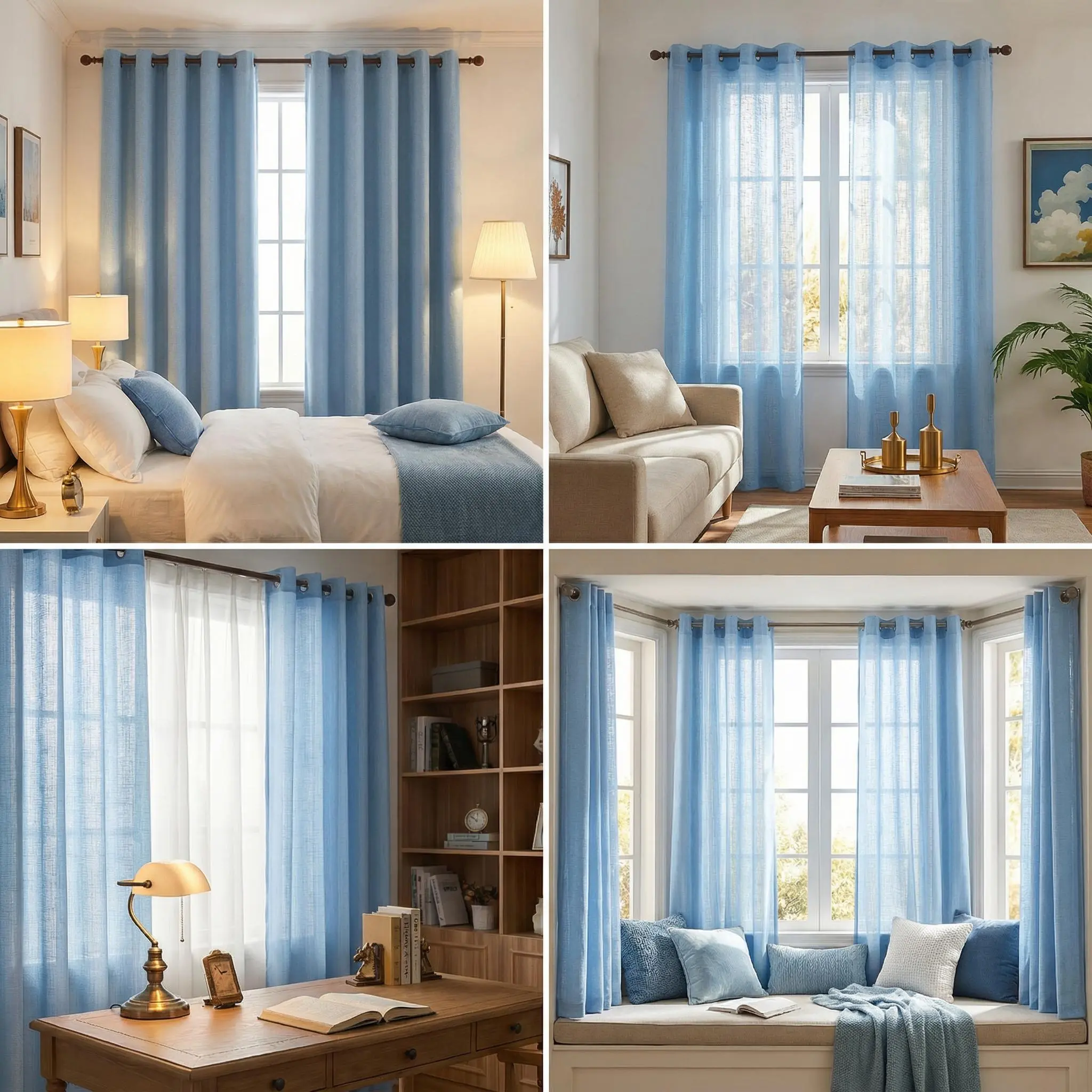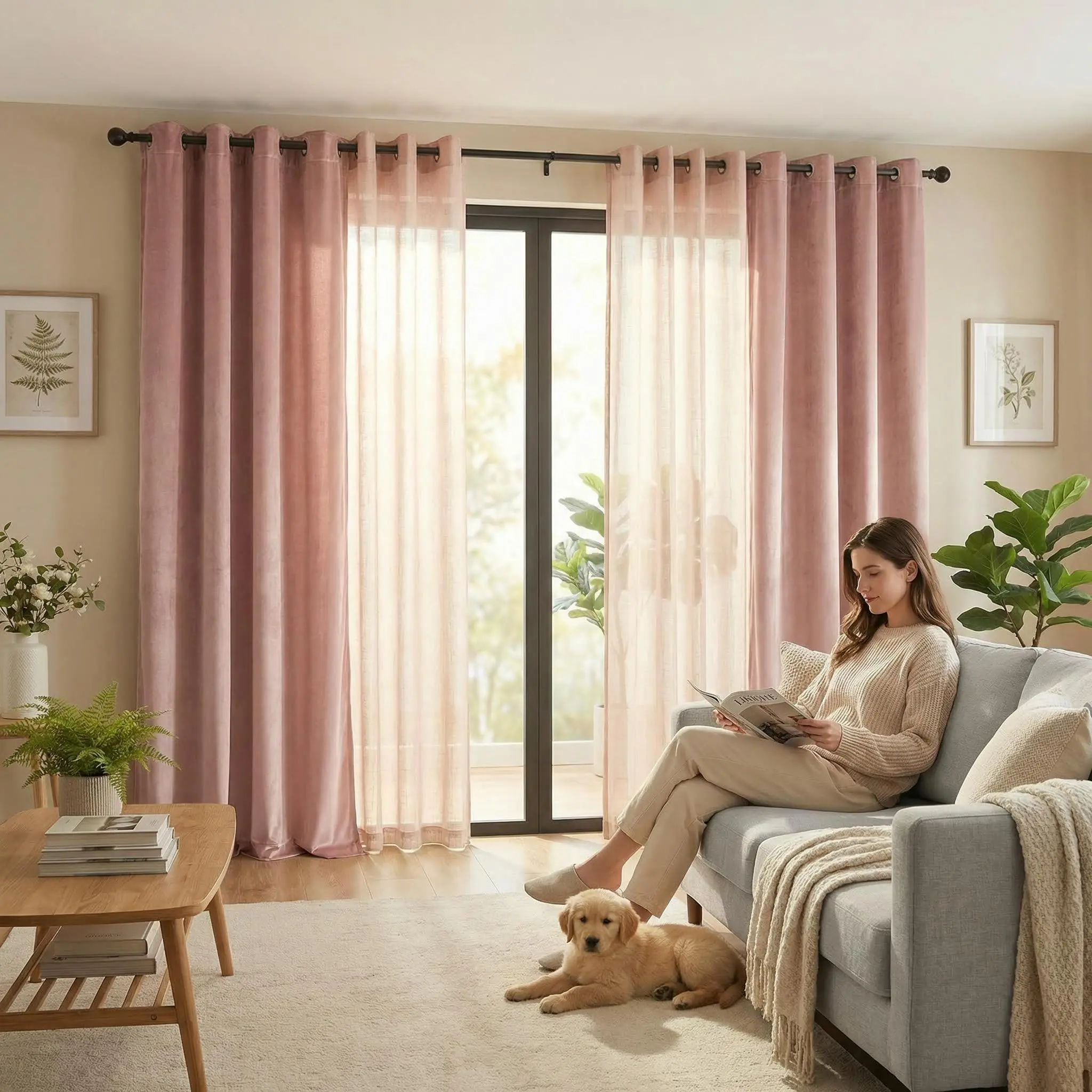The 2 panels are made of blackout fabric, providing complete blackout effect. The other 2 panels are mesh wide-mouth curtains in a loop style. This combination ensures both functionality and style for your space.