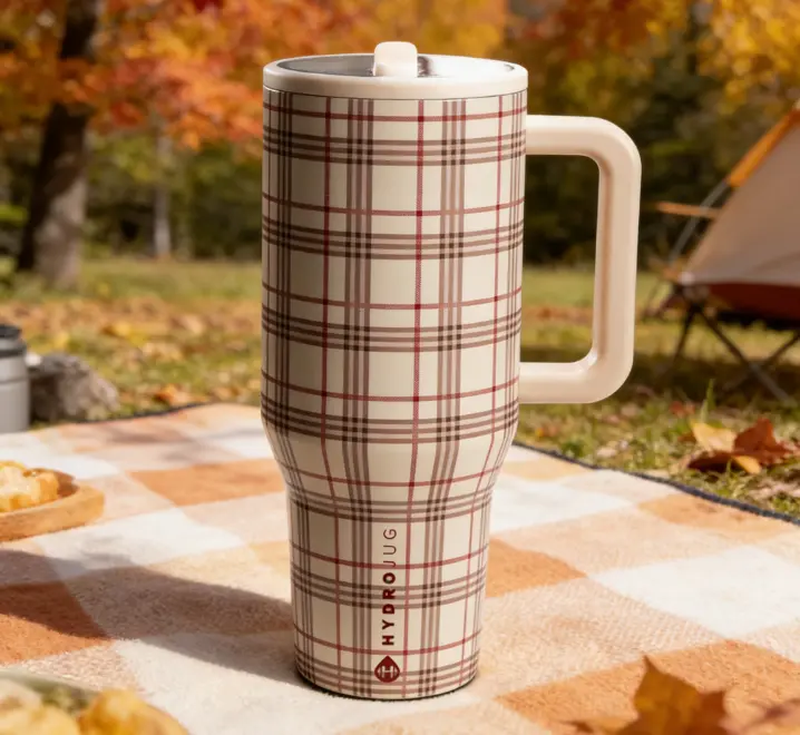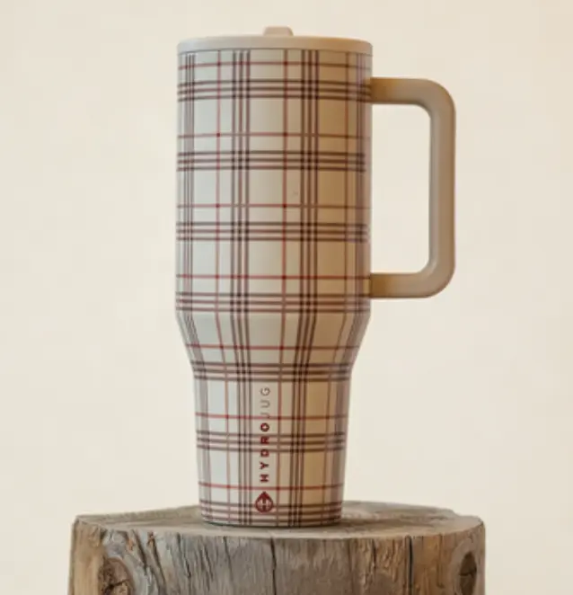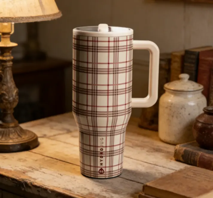 Stay hydrated in style with the HydroJug 40oz Plaid Insulated Tumbler. This leak-proof stainless steel travel cup keeps your drinks cold for 24 hours and hot for 12 hours. Perfect for on-the-go use, it features a handle and flip straw for easy sipping. Ideal for travel, this tumbler is a versatile drinkware option.