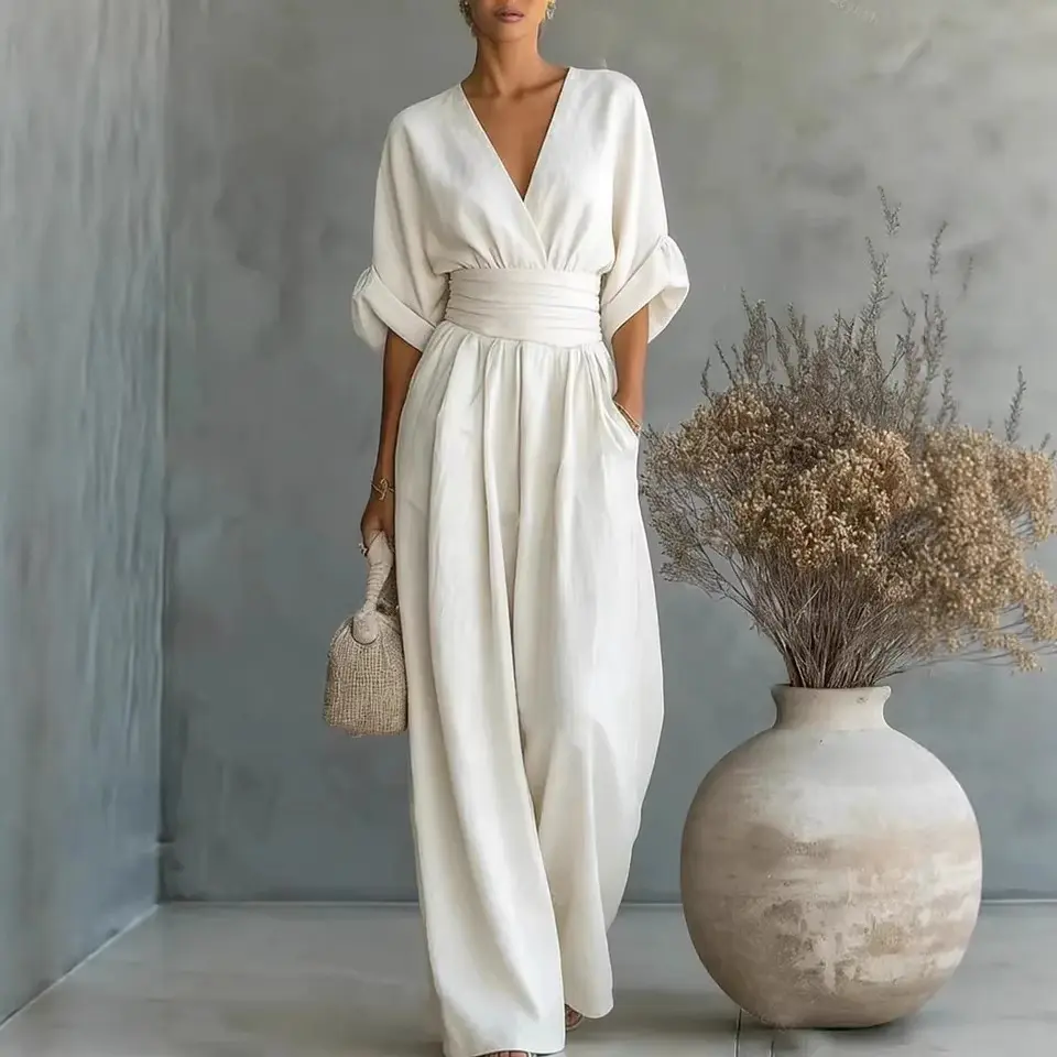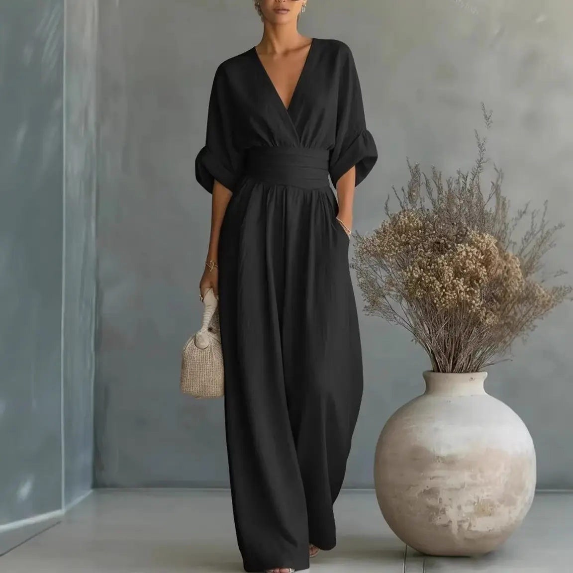 This new spring summer elegant women's jumpsuit features a flattering V neck and waist cinching design. The tailored fit highlights your natural curves while the flowing wide leg creates a slim silhouette. Perfect for casual daily wear office or evening outings. Soft breathable fabric keeps you comfortable all day. A versatile wardrobe staple that combines style and comfort effortlessly.