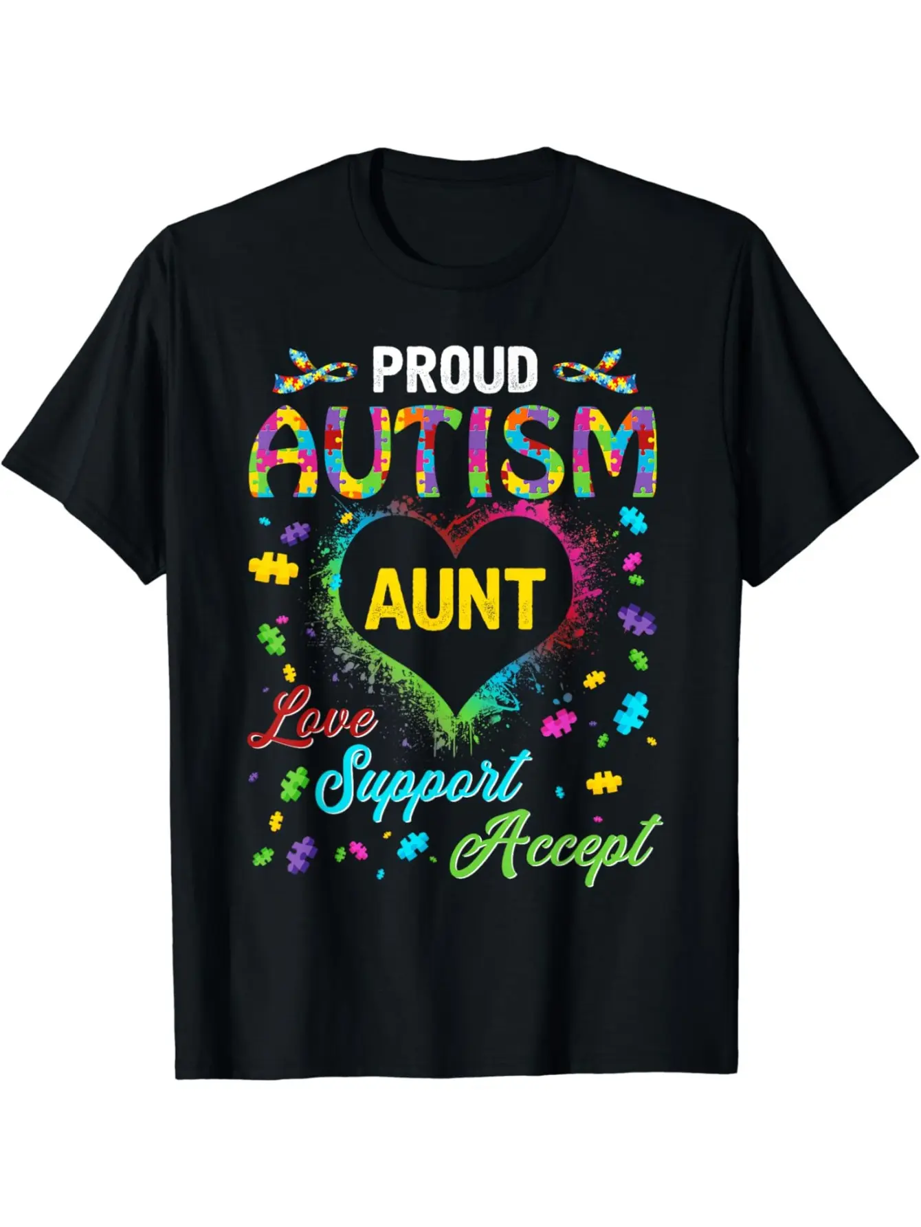 Men's Autism Awareness T-Shirt - Soft Stretchy Relaxed Fit with Puzzle Piece & Rainbow "Autism Aunt" Design, Black & Colorful Support Shirt for Casual Wear, Charity Events & ASD Community (Machine Washable)