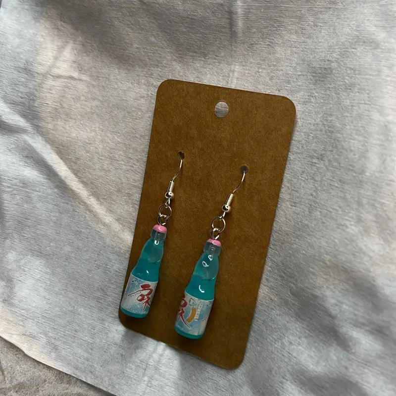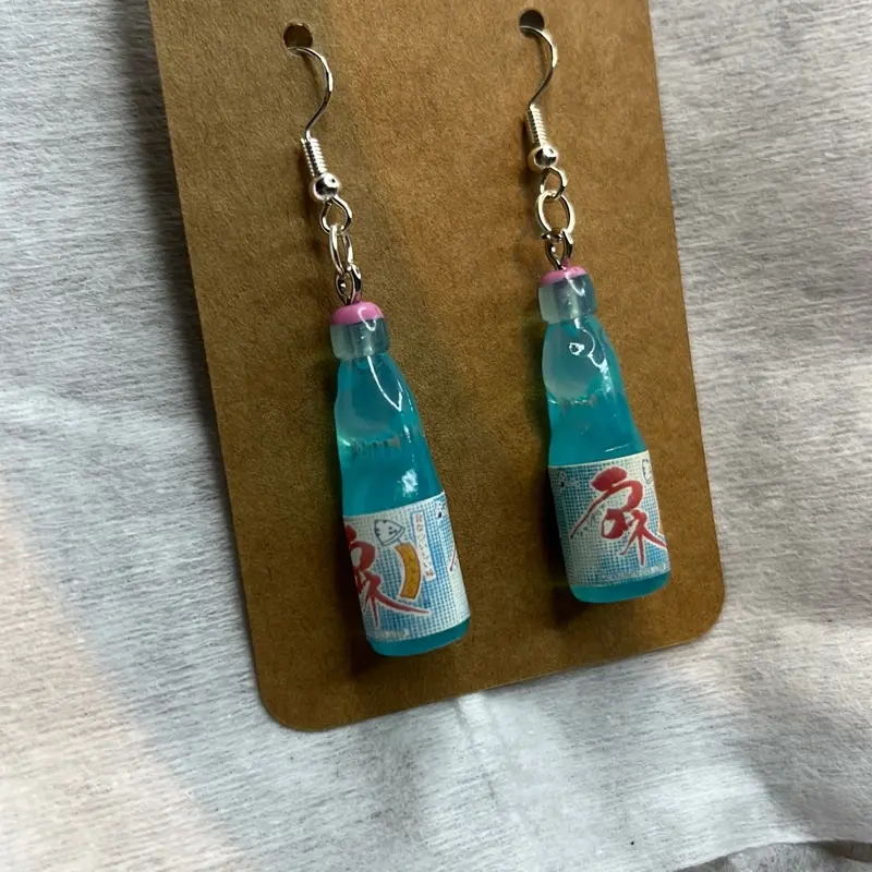 ·Unique Bottle Design: These earrings feature a distinctive bottle shape, inspired by Japanese soda. The design includes Asian characters, adding a cultural touch. Perfect for casual wear, they bring a playful vibe to any outfit.