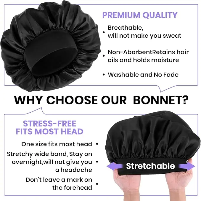 ·【You Will Get】The satin silk hair bonnet for women hair consists of 1PCS wide-brimmed satin nightcap with inner satin, bonnets for black women is enough for your daily replacement or use, and you can also share silk bonnet for men with your family or friends.