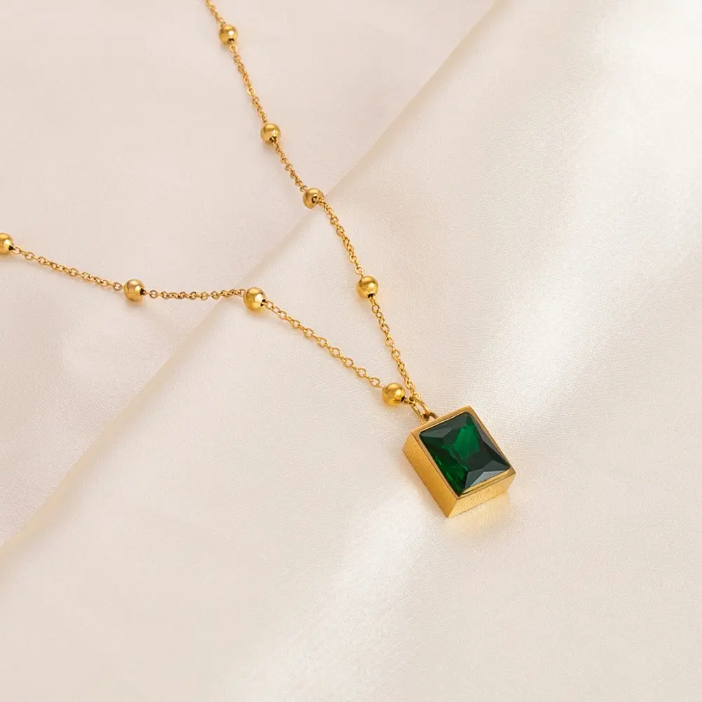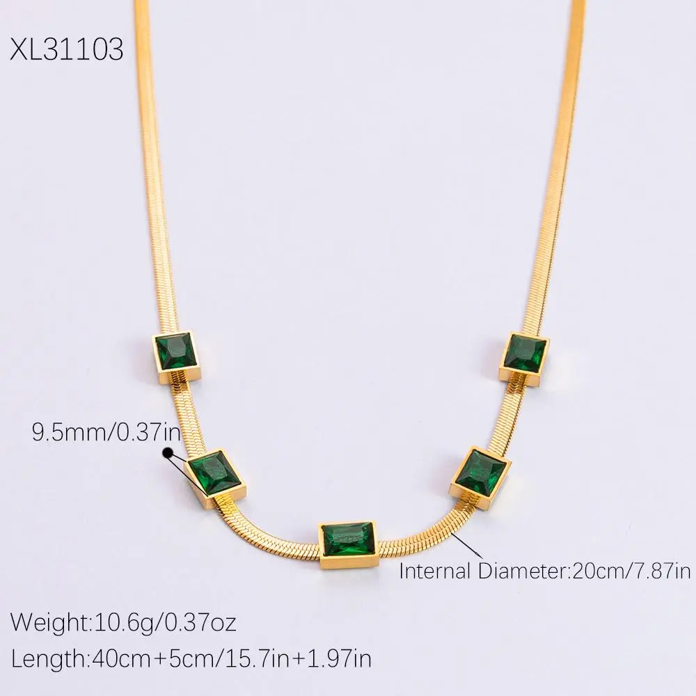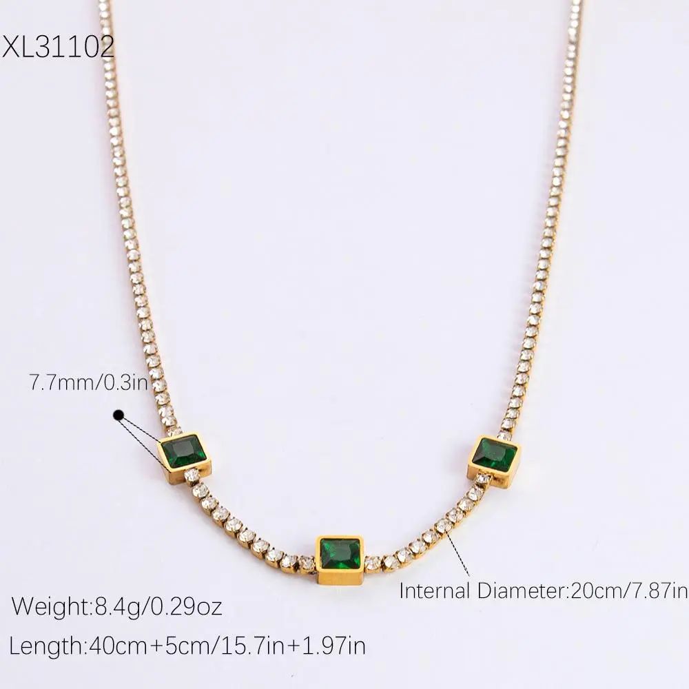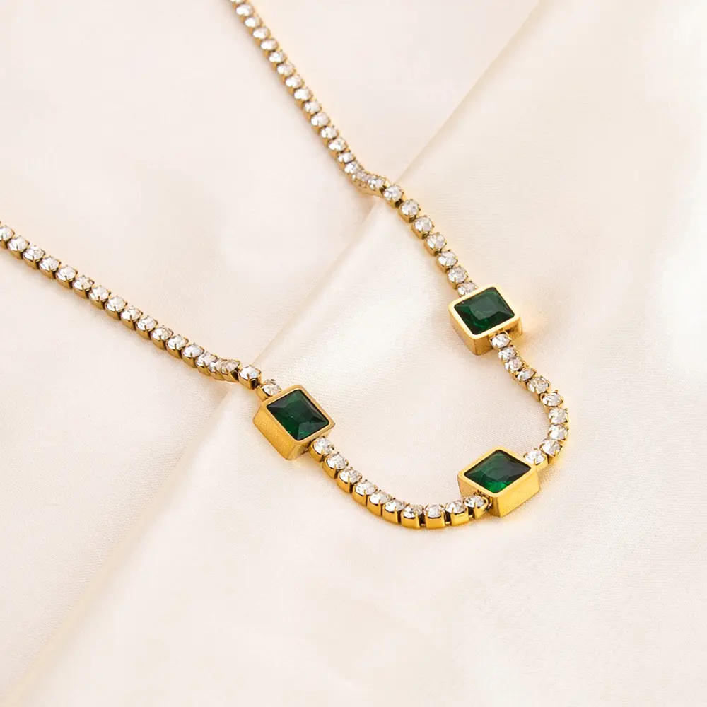 Stainless steel necklace plated with 18K gold, square emerald green rhinestone zircon clavicle chain necklace jewelry