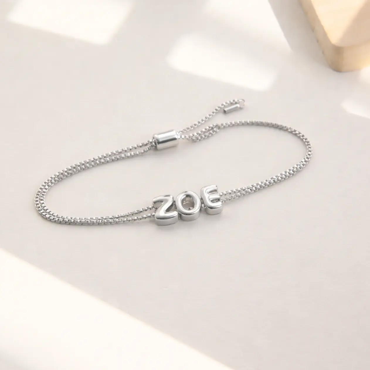 Personalized your bubble letter bracelet with a delicate adjustable chain and an optional signature heart detail. Designed to feel personal, effortless, and timeless.