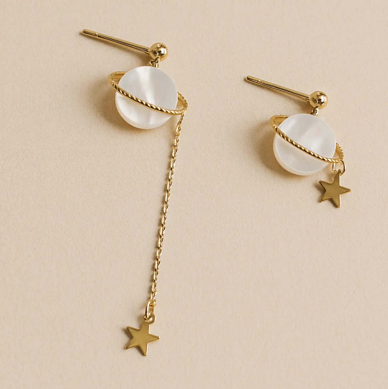 The Cosmic Love Earrings capture the beauty of celestial balance . These asymmetrical earrings exist harmoniously. Crafted from stainless steel with gold plating, these asymmetrical earrings feature a radiant pearl-like finish orbited by a golden ring and tiny star charms that glimmer with every movement.