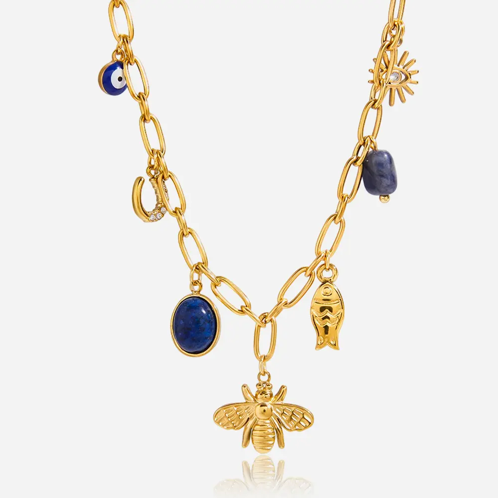 Elevate your everyday style with our Evil Eye & Honey Bee Necklace. This unique piece combines the ancient symbol of protection with the delicate beauty of a bee, making it more than just a necklace—it’s your daily charm.