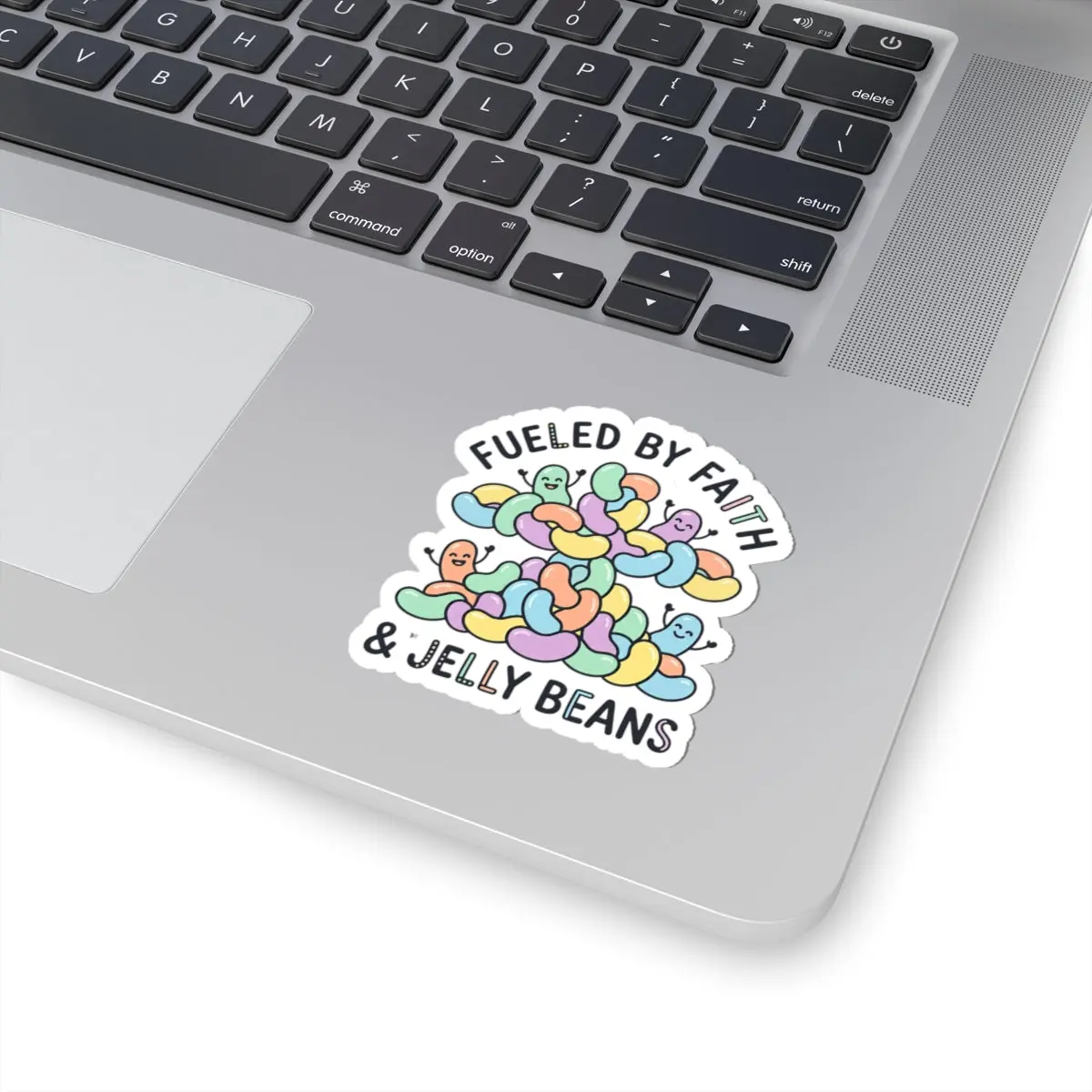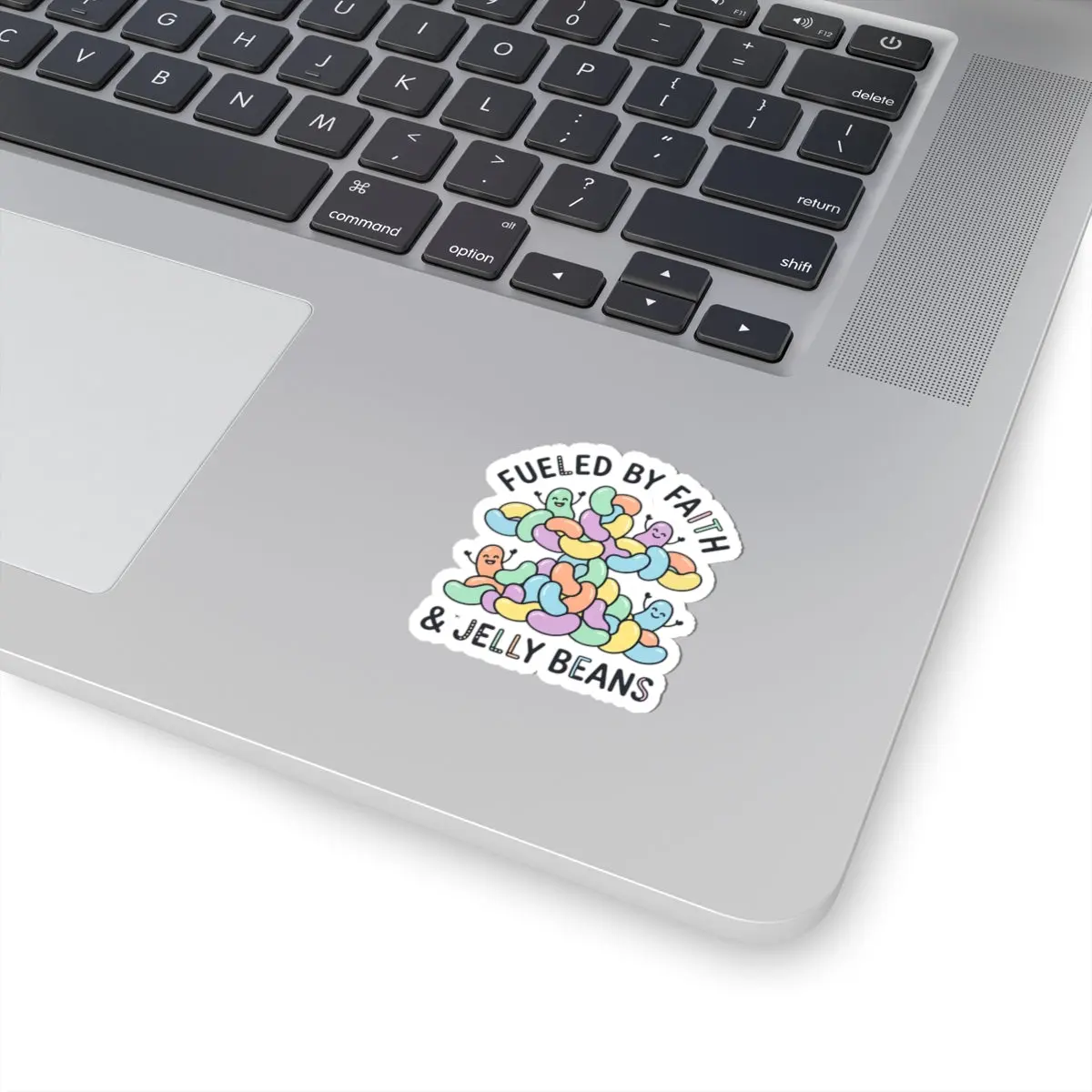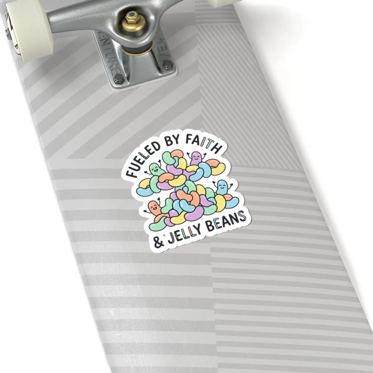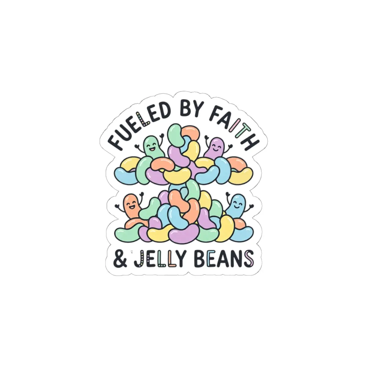A pastel retro-style kiss-cut sticker featuring a playful pile of smiling jelly beans and the cheeky faith-forward line “Fueled by Faith & Jelly Beans.” The artwork blends soft Easter pastels, simple rounded characters, and clean friendly lettering to convey warm, family-friendly church humor that fits the Playful Christian Easter Humor trend. It works as a lighthearted reminder of resurrection-season joy — a small, approachable accent for laptops, journals, water bottles, or church event swag that appeals to multi-generational families and youth groups.