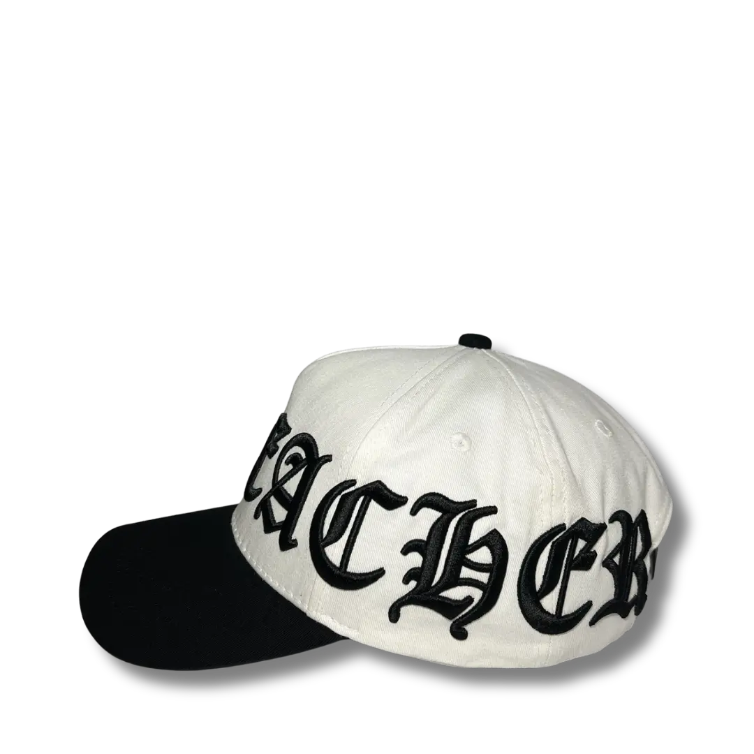 The Legacy Hat features bold Old English embroidery across a clean cream crown, finished with a deep black brim for a timeless, high-contrast look.
