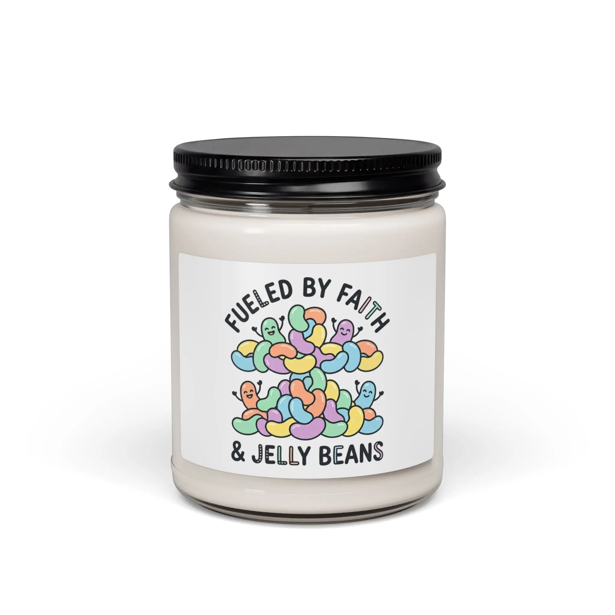 A small soy candle with a playful, faith-forward label that blends gentle Easter humor and pastel retro charm. The artwork features a pile of colorful, smiling jelly-bean shapes beneath a friendly, rounded slogan about faith and jelly beans — a lighthearted nod to church snack tables and family traditions. Soft pastels and clean typography give a warm, approachable vibe that fits seasonal decor and multi-generational Easter celebrations.