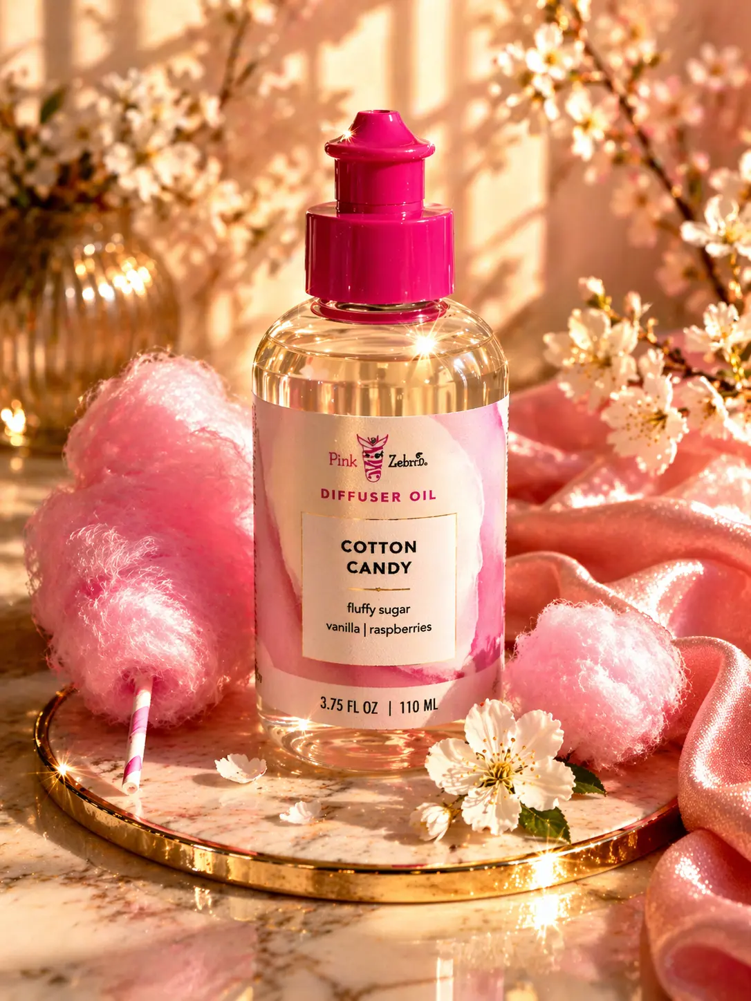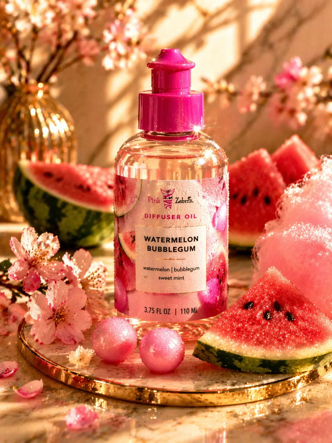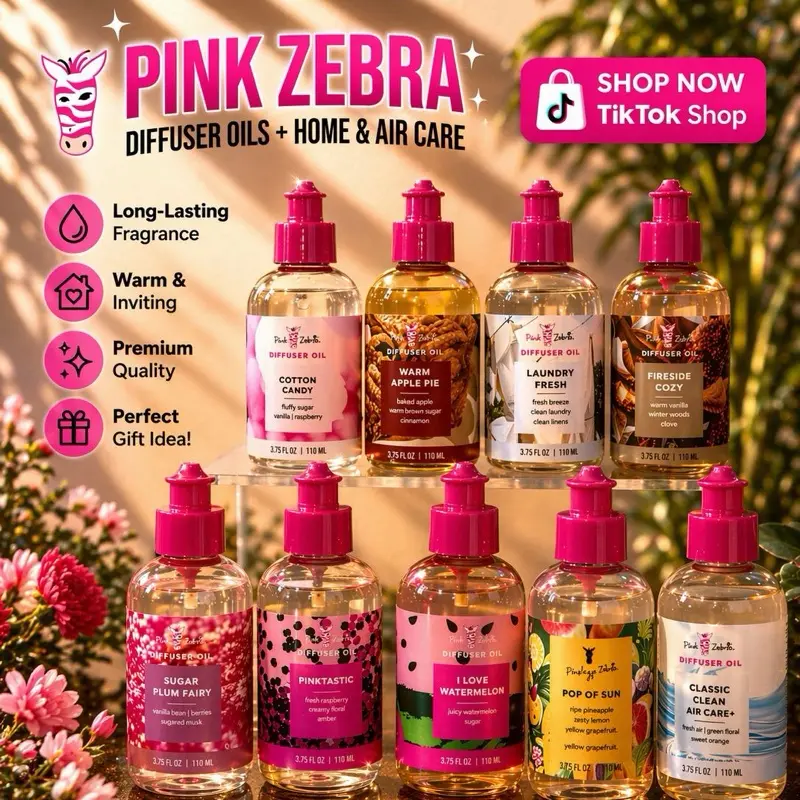 Pink Zebra Diffuser Oils are concentrated fragrance blends available in 3.75 oz (110 mL) bottles, designed for versatility across various home and automotive scenting products. These eco-friendly, non-toxic oils are crafted in the USA with essential oils and are safe for use around kids and pets (excluding birds).