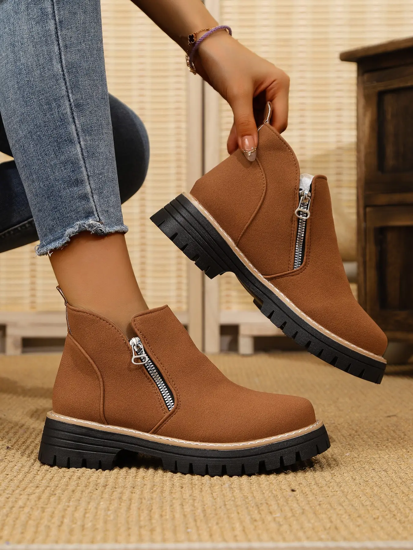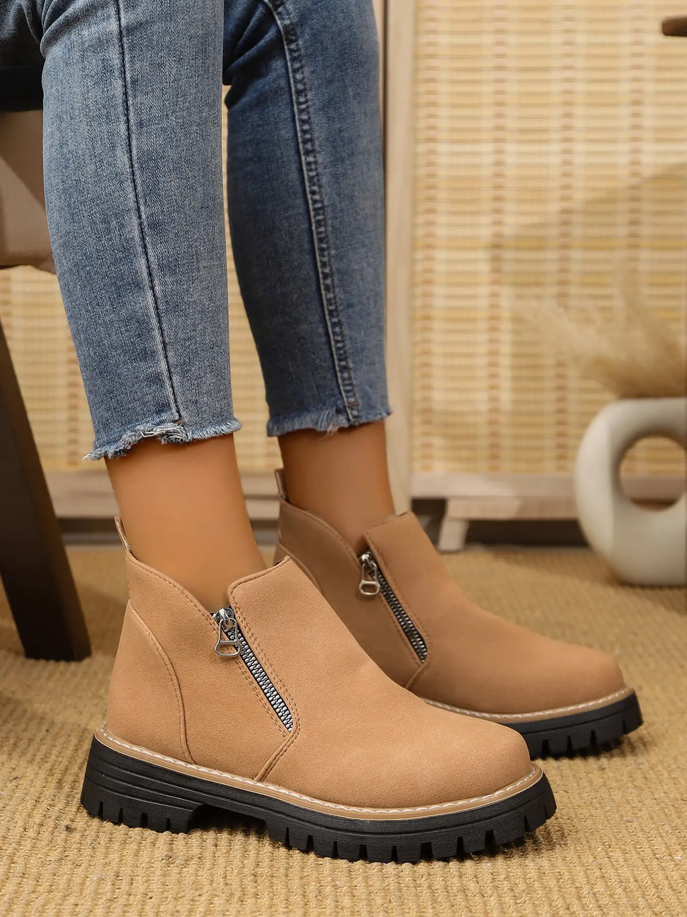 Women's Vintage Textured Thick Sole Chelsea Boots, Side Zipper Easy On/off, Height-Boosting Round Toe Short Boots, Anti-Slip Comfortable Outerwear