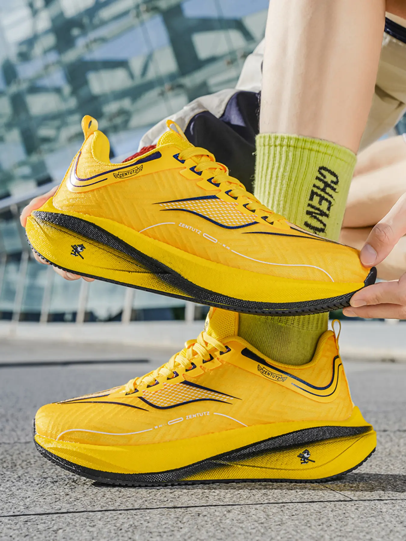 Unisex Bright Yellow Racing Mesh Running Shoes, Platform Non-slip Wear-resistant Professional Sports Sneakers