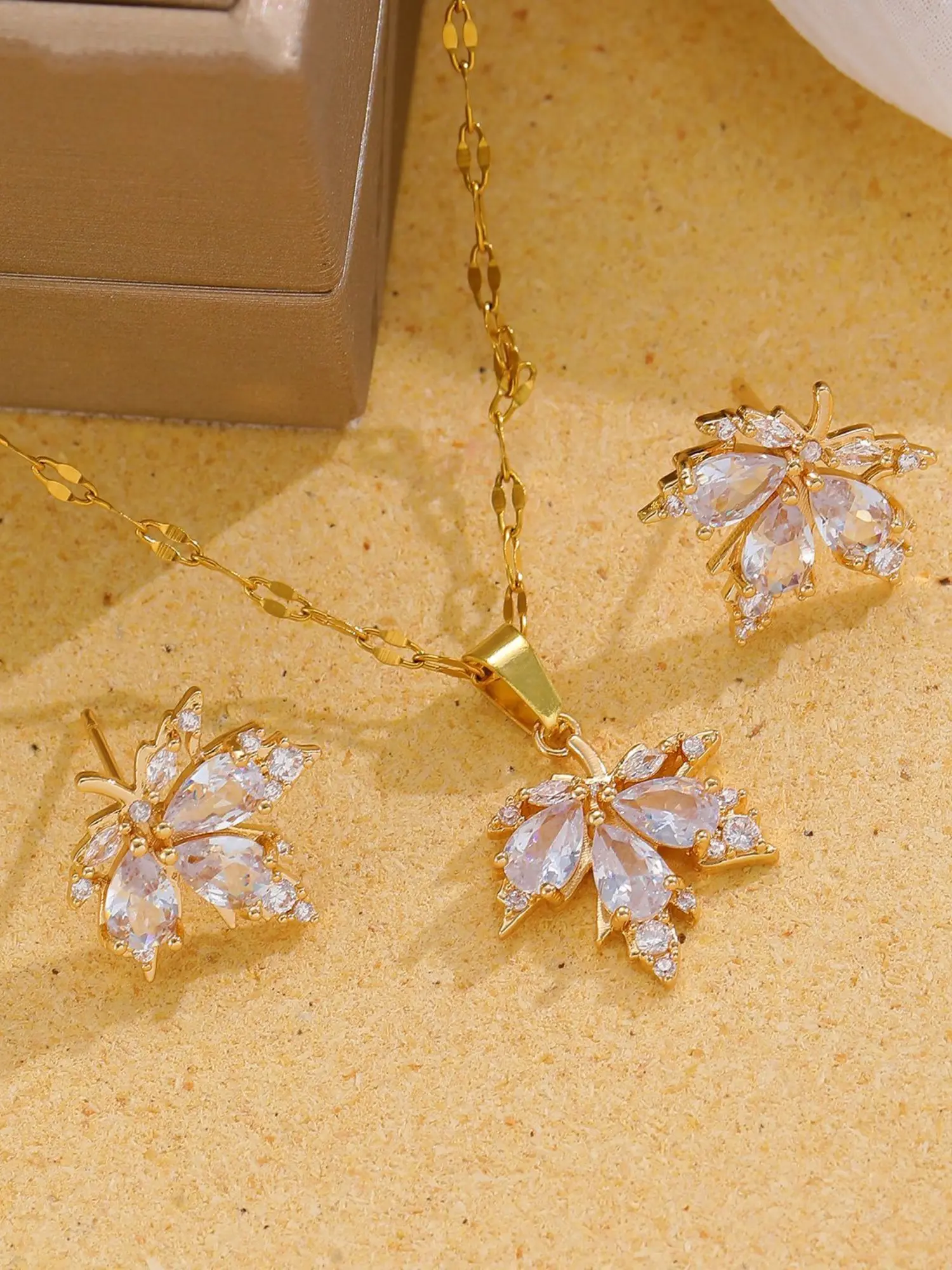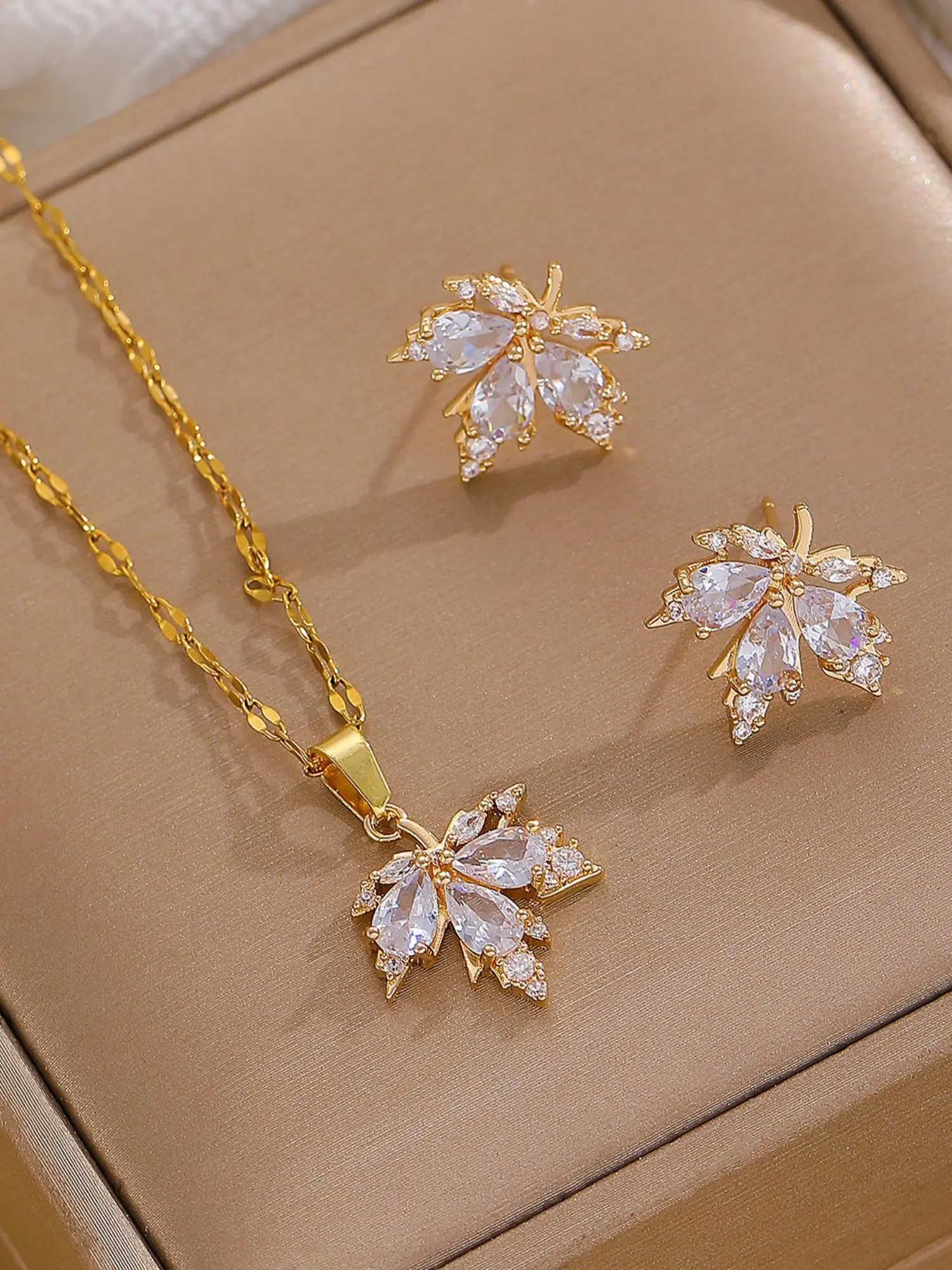 Maple Leaf Zircon Necklace Earrings Set, Elegant Jewelry for Women, Wedding Dinner Wear, Hypoallergenic, Sparkling, Skin-Friendly