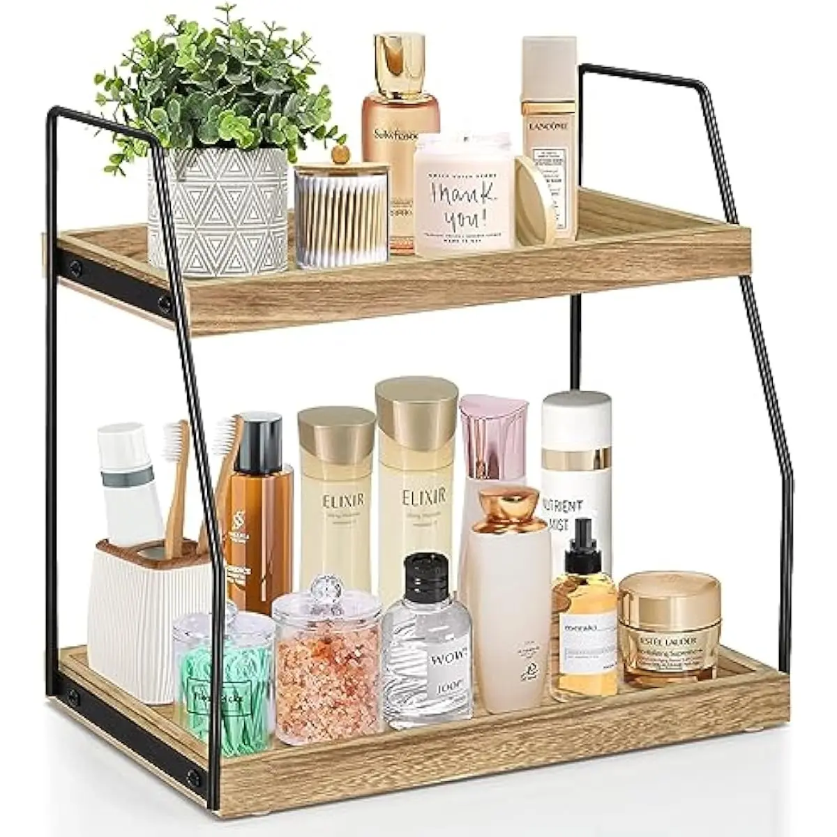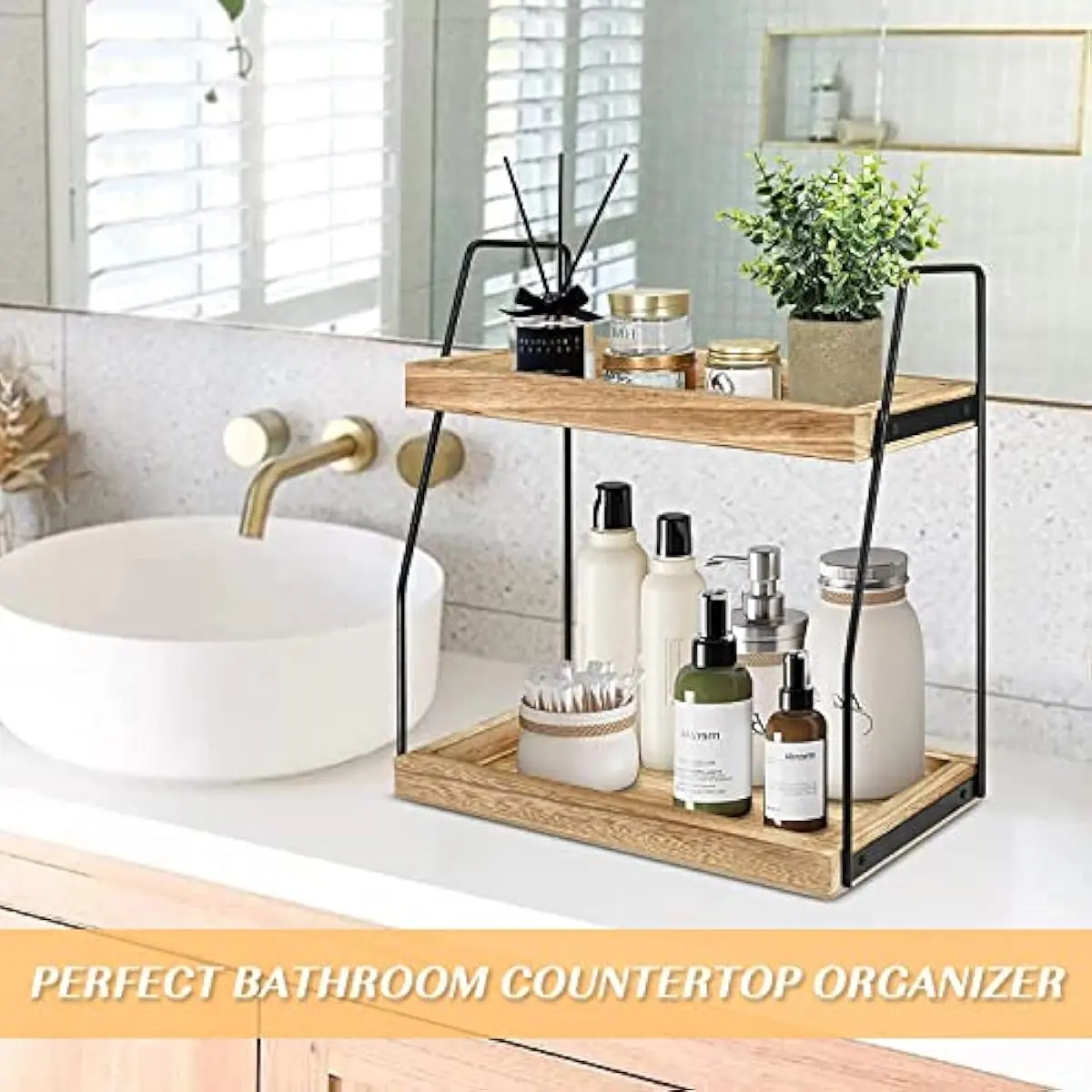 Our bathroom counter organizer is made of solid wood, durable and stable. This countertop organizer is easy to install. Made of premium iron and sprayed with eco-grade paint, the standing shelf is sturdy to use and easy to clean, rust proof and water proof.