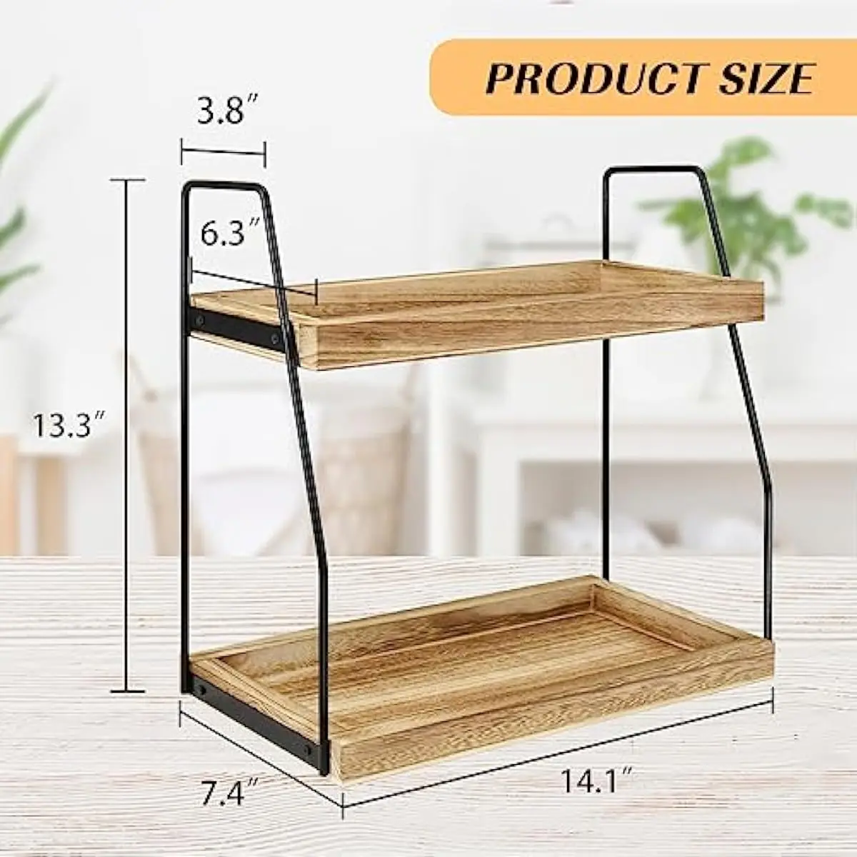 😄Perfect Space Saver- Bathroom OrganizerWith double layers, the top shelf measures 14.1 L x 6.3 D, bottom shelf measures 14.1 L x 7.4 and the total height is 13.3. It can save your room space to the maximum, making things well organized and orderly stored and creating a comfortable micro-environment for your home or office. This bathroom counter organizer is a great gift idea for Christmas, Birthday, Anniversary, Mother's Day, etc.