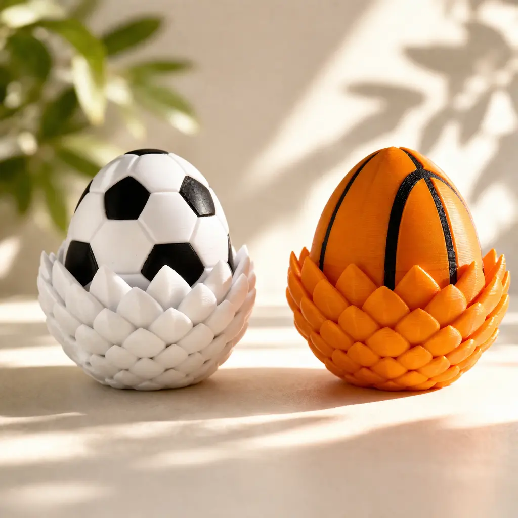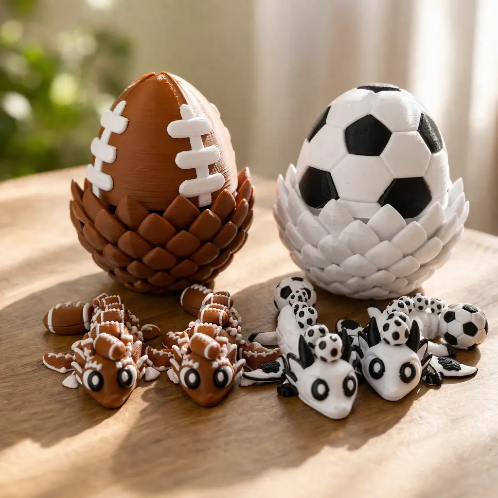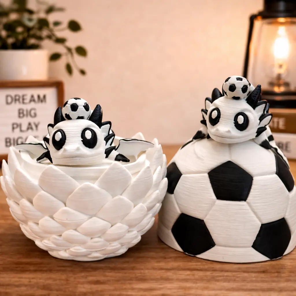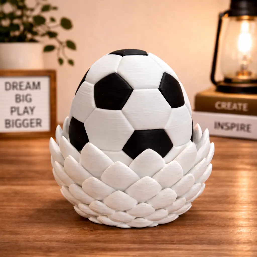 This Soccer Dragon Egg Figurine features a soccer-inspired outer shell combined with a detailed dragon egg design. Inside, it reveals two mini dragon figures, creating a bold layered display that stands out on any desk or room setup. A unique piece that blends sports elements with a fantasy concept.