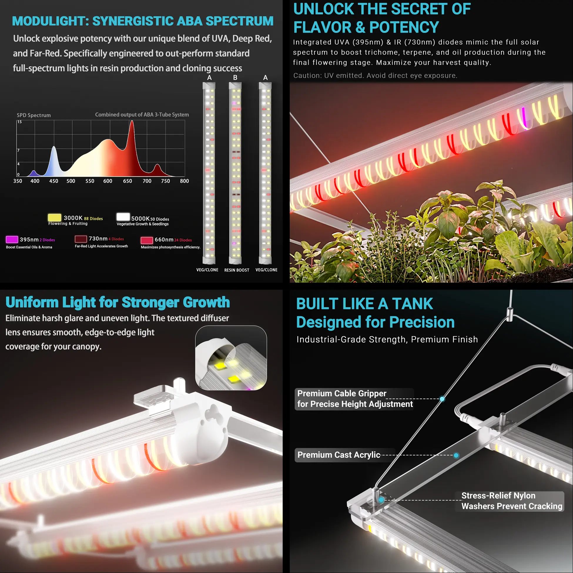 Resin Boost Technology: Integrated ABA Combo Spectra with 395nm UVA and 730nm IR diodes specifically engineered to maximize essential oil production, terpenes, and plant potency.