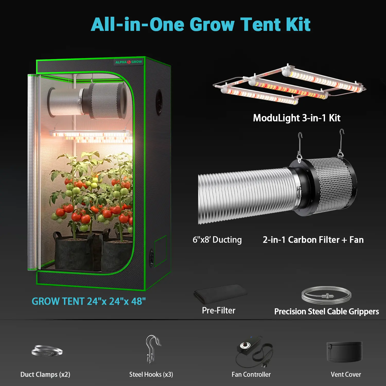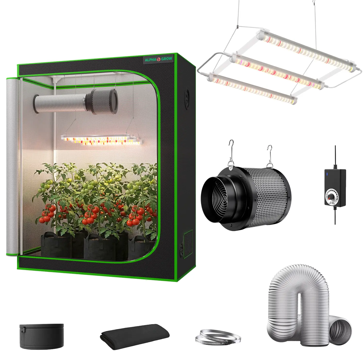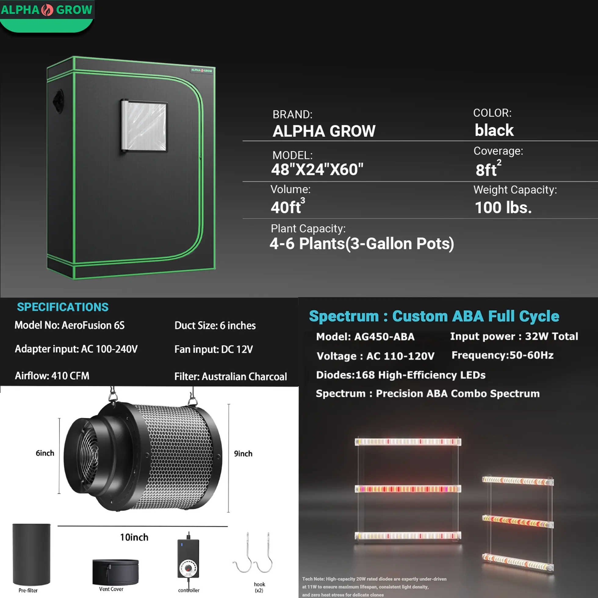 ALPHAGROW Pro Complete Grow Tent Kit - 1680D Heavy Duty Tent, UVA/IR Boost ABA Spectrum LED, 6-Inch Stealth Ventilation System with Odor Control