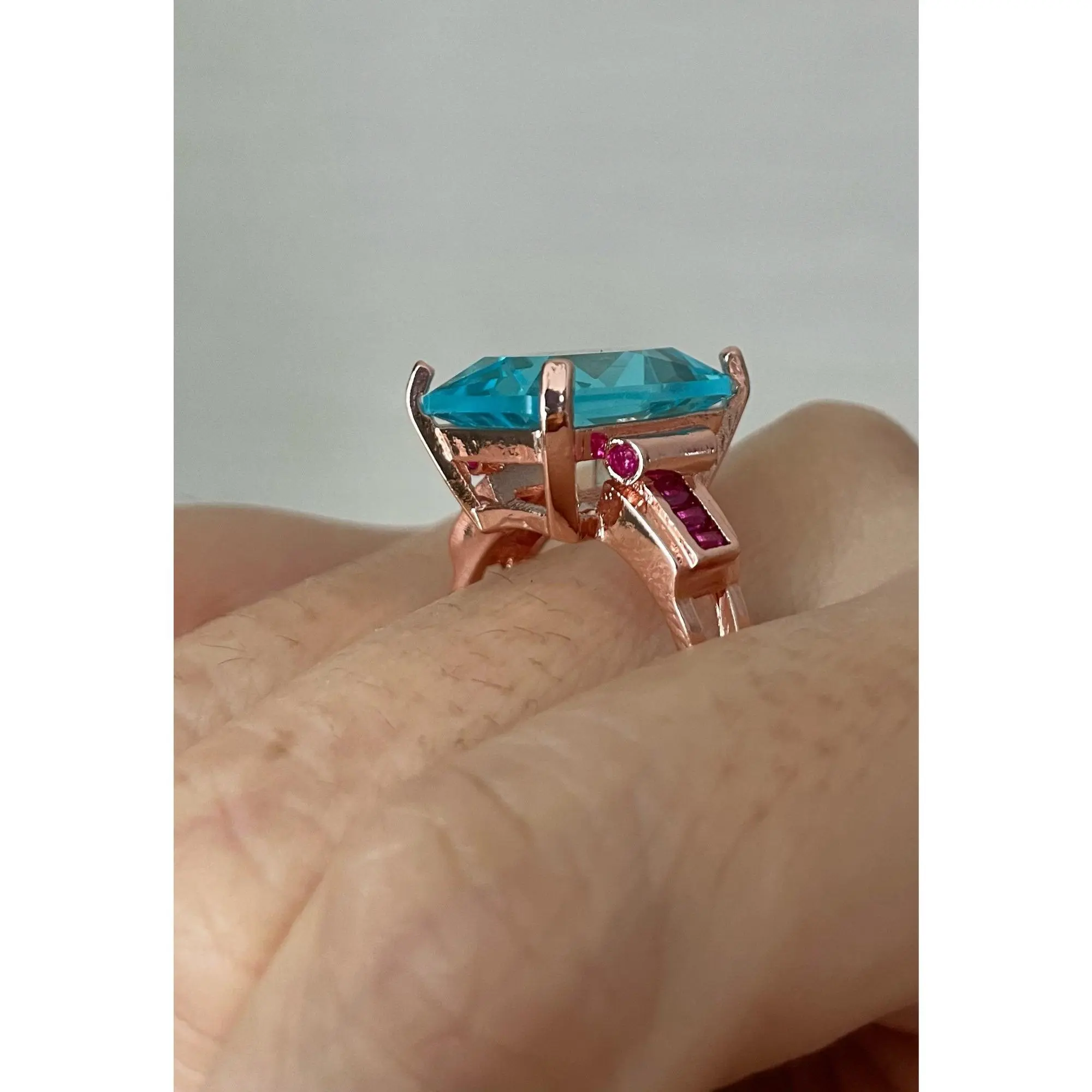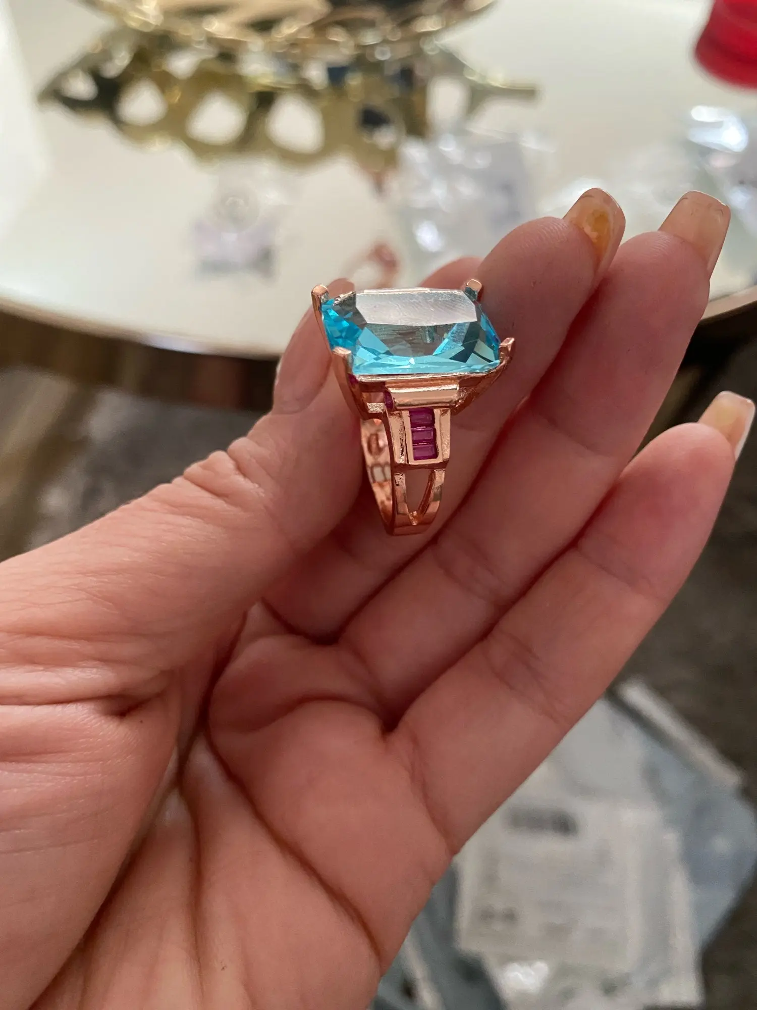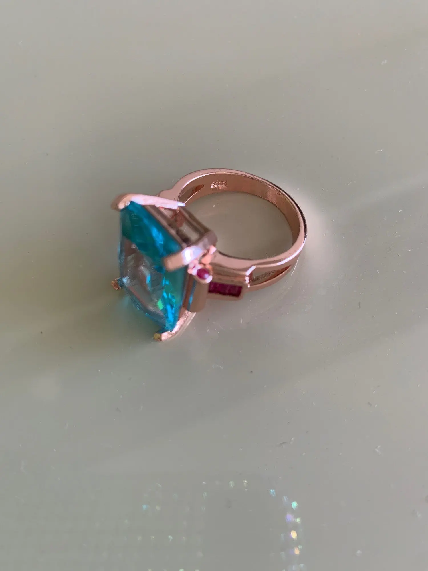 Huge Sterling Silver Sea Blue Rhinestone Emerald Cut Ring