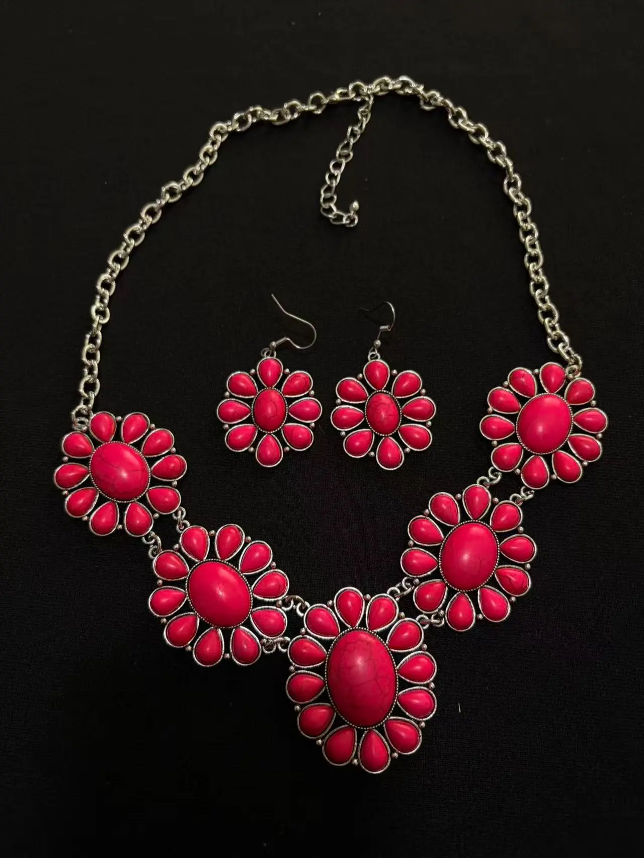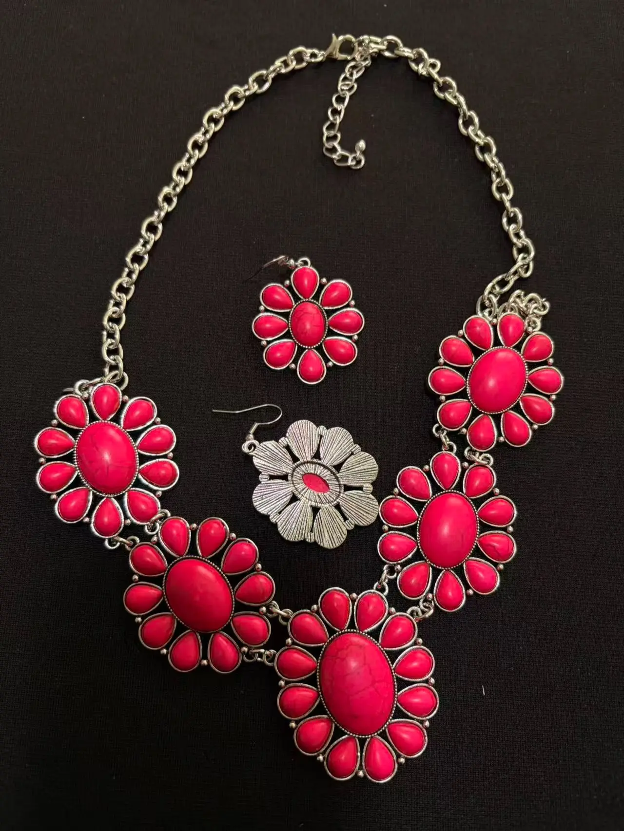 • Design & Artistry: The necklace features a centerpiece crescent "Naja" pendant, intricately set with authentic turquoise and white matrix stones. The strand is adorned with coordinating blossom-style conchos, all strung on a double row of traditional oxidized silver-style beads for a bold, layered aesthetic.