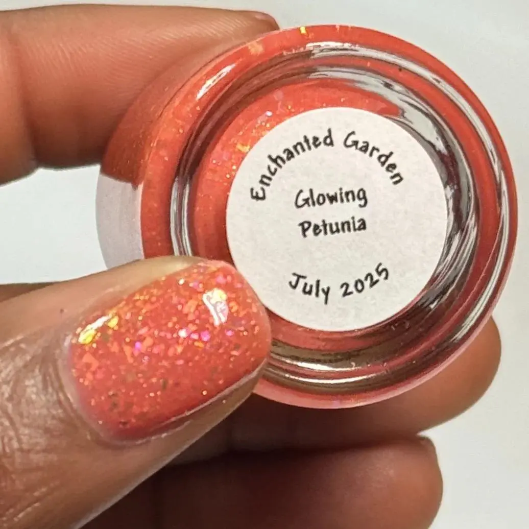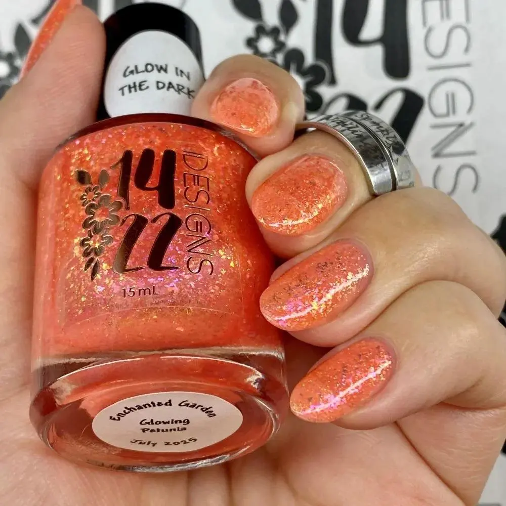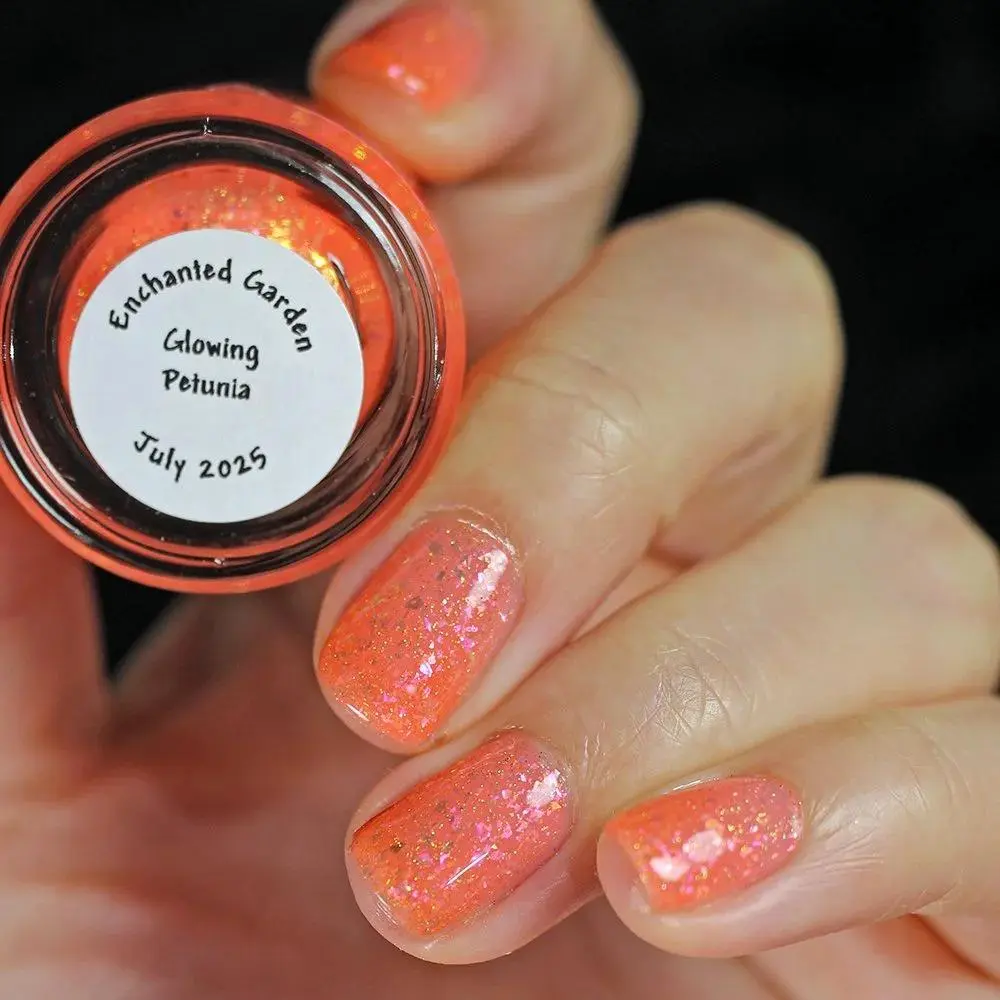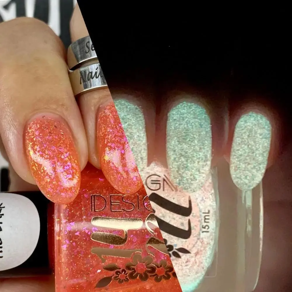 This peachy orange nail polish offers a vibrant, summery hue enhanced with iridescent flakes that catch the light for a subtle shimmer. Tiny gold holographic micro glitter particles add a luxurious sparkle, creating a multidimensional effect. In the dark, the polish glows with a soft white-orange radiance, making your nails stand out both day and night.