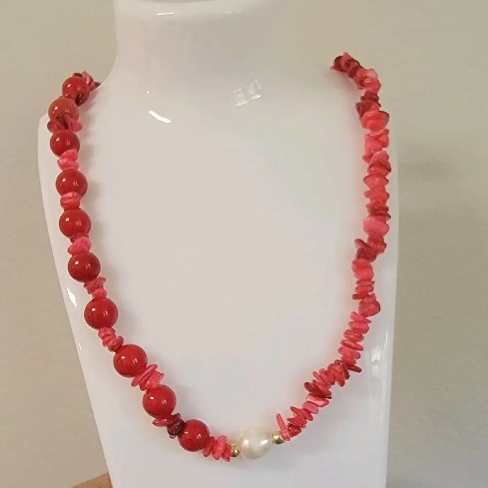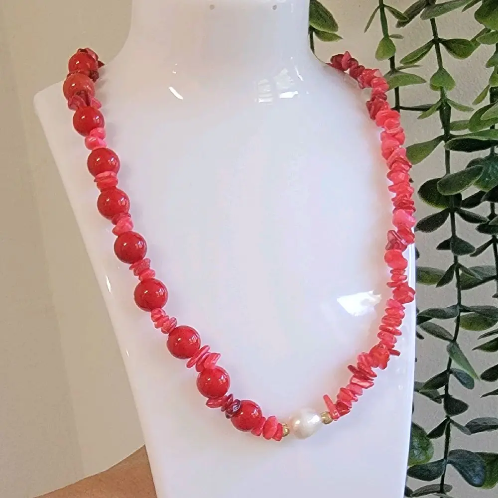 This handcrafted necklace features vibrant red coral-style chip beads paired with round polished beads for added texture and dimension. At the center, a beautiful baroque-style pearl creates an elegant focal point, adding a touch of sophistication to the bold design.Lightweight and eye-catching, this necklace is perfect for everyday wear or special occasions. Its unique combination of natural-inspired elements and rich color makes it a standout accessory and a thoughtful gift.