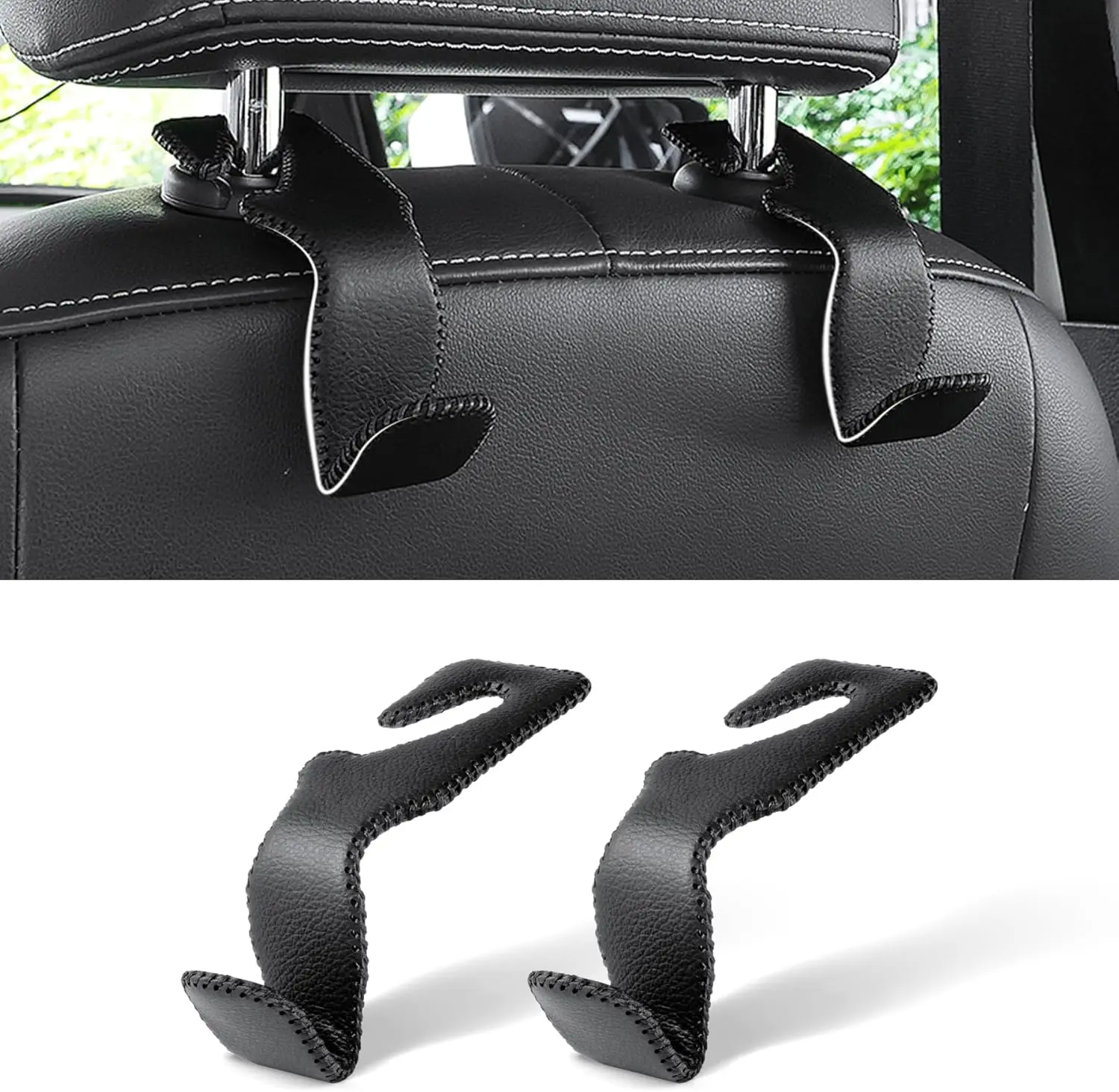 ·【360° Rotation】Hooks rotate smoothly to hang items on the front or back of the seat, or tuck neatly under the headrest when not in use. The leather-covered surface feels premium and smooth, providing both functionality and style for an organized interior.