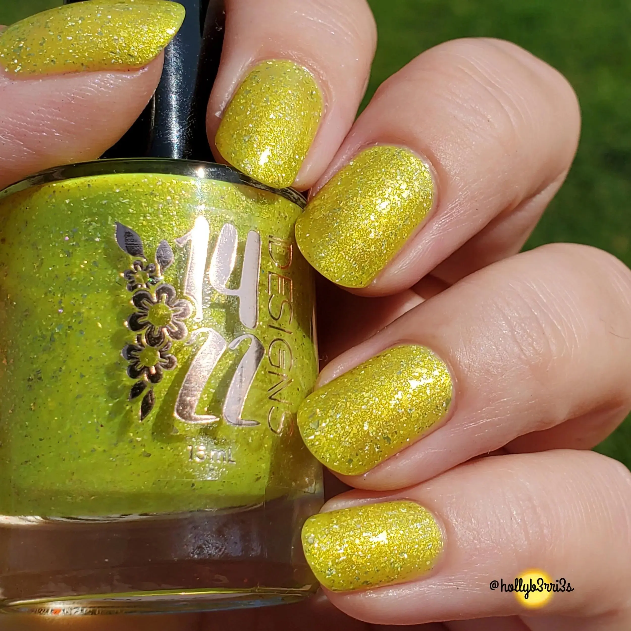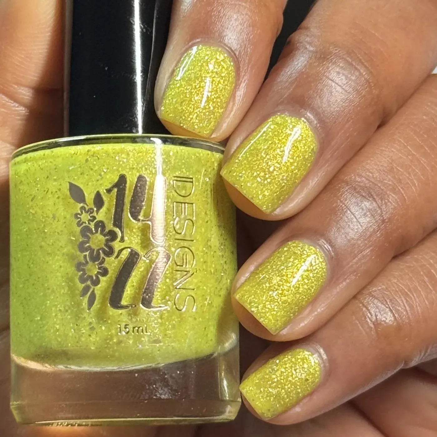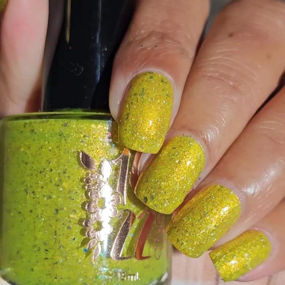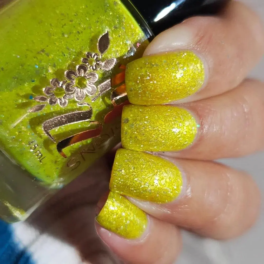 A vibrant, cheerful yellow nail polish that instantly brightens your look. This shade features a captivating gold-orange-green shifting shimmer that catches the light from every angle. Embedded with sparkling gold metallic flakes and dazzling holographic flakes, it creates a multidimensional finish that’s perfect for adding a touch of sunshine and sparkle to your nails.