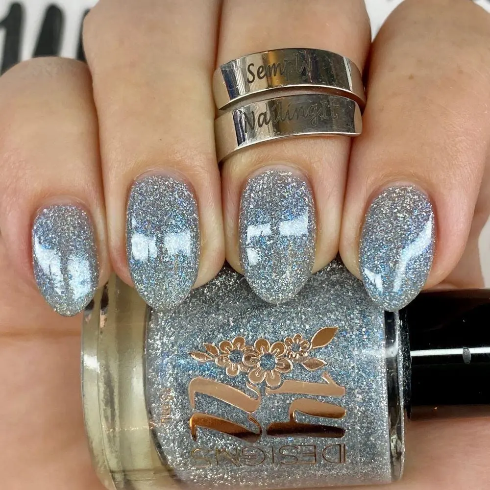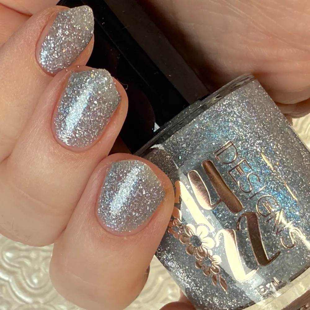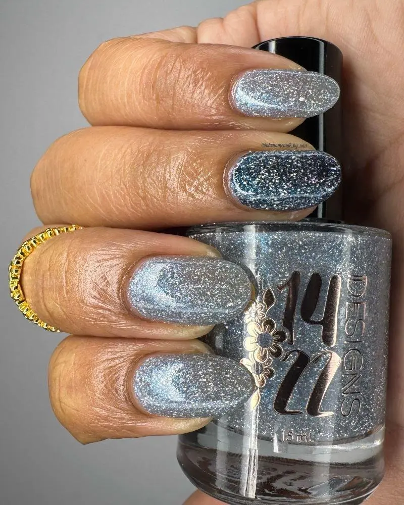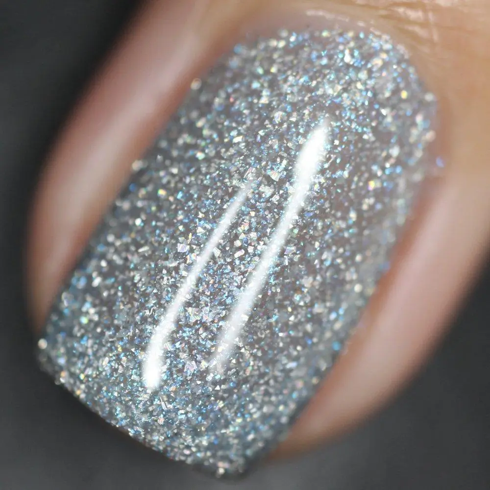 This gray nail polish features a sophisticated base with subtle blue sparks that add depth and dimension. Silver reflective glitter enhances the sparkle, while holographic flakes create a captivating multidimensional effect that catches the light from every angle. Perfect for a modern, edgy look with a touch of sparkle.
